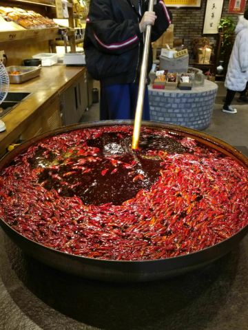 如果你仔细观察会发现在成都的街头有很多的味纲门店,而且他们都开在了成都的旅游景点地。这次在锦里也发现了他们家的门店,但是这家店并不在锦里景区里面,而是在锦里大门的左手边的位置,确切的说是靠着卫生间的位置。 他们吸引我的原因很简单,就是因为门口的那一个大大的锅锅里面放着油和辣椒,在炼制着火锅底料。所以他们家的主产品也是以火锅底料为主,而且还和一些年轻的创业者合作共同加盟。