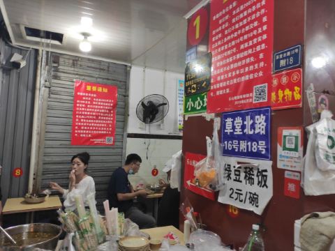 蓝海清风1号店名:乐山鲜知味钵钵鸡 地址:草堂北路16号附18号 交通:地铁4号线到草堂北路站B口出 营业时间:上午11:30——晚上23:30 这家店有三个门面空间,生意比较好,晚上人很多,也是一家成都网红店了。 本人在这点了一份鸡汤泡饭,价格4元,吃起来鲜香味美,个人感觉比串串更值得推荐。 这里的串串价格按签算,荤素都是每签0.5元,好点的钵钵鸡签数会多点,本土豆片人来点的钵钵鸡串串有鸡脚(5签)、土豆片(1签)、笋尖(2签)、鹌鹑蛋(2签)、鸭肠(1签)、郡把(1签),六样串串12签记6元。加上鸡汤饭共消费10元。 这家钵钵鸡有两种锅底口味可选,分别是红油麻辣味和藤椒味,选红油麻辣味锅底的比较多,本人也是给加的这个锅底底料。