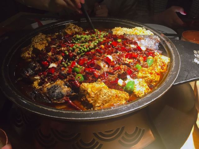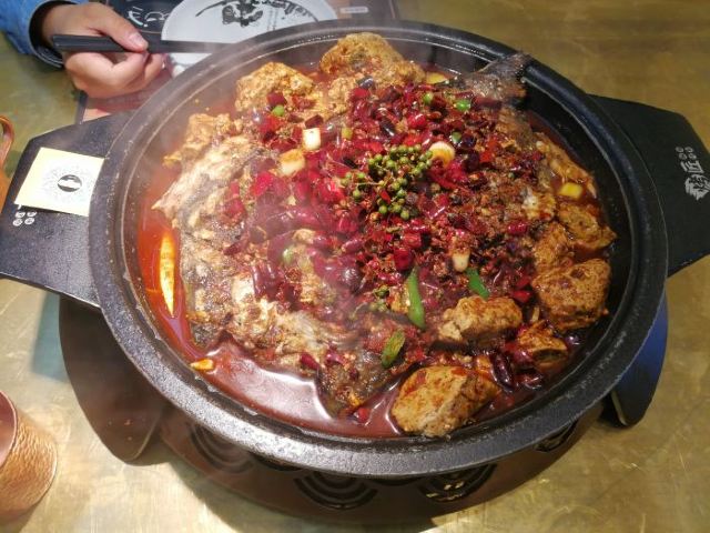 YoYo_9M7W8K0E没想到工作日中午也这么 幸好聚餐人多,大桌还有位~11点45到,没有排队就进去了! 6个人,点了经典麻辣和青柠酸辣味的黔鱼,推荐「麻辣豆花烤鱼」~真的是他们家最好吃的口味了;青柠酸辣,算泰式口味吧,酱里加了香菜和各种香料,不能吃香菜的建议不要点,不过真不辣,适合吃不了辣的小伙伴。加了5份配菜,黑豆花、土豆最棒~「芝士烤红薯」很好吃!口感顺滑也不腻。「包浆豆腐」表面盖了一层折耳根叶子碎,建议吃不了的童鞋直接拨掉!「红糖糍粑」中规中矩,很常见的口味。 点麻辣口味,还每人赠送了一小盒花椒冰淇淋,吃个新鲜吧~花椒很青翠[嘿哈] 6个人中午胃口不大,点菜363,减一个大众点评团的包浆豆腐券和50元代金券后,很划算,人均不到50~