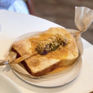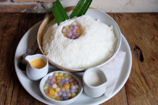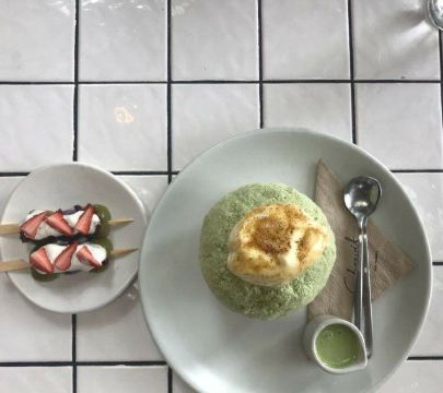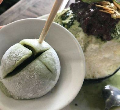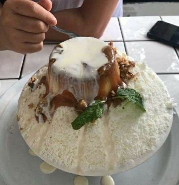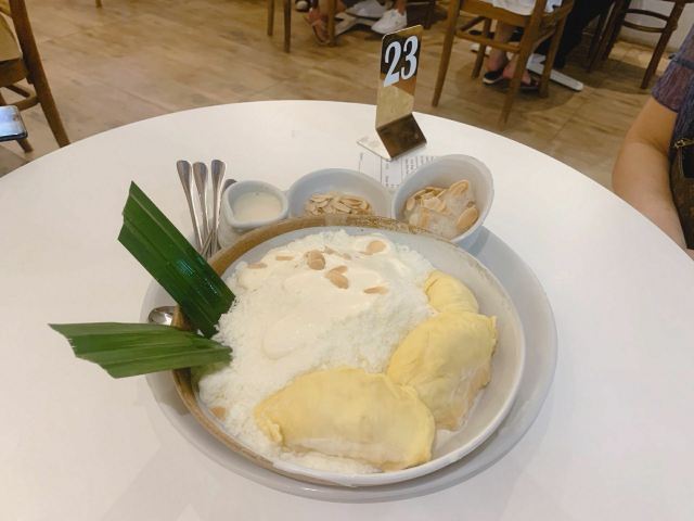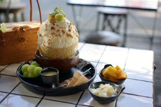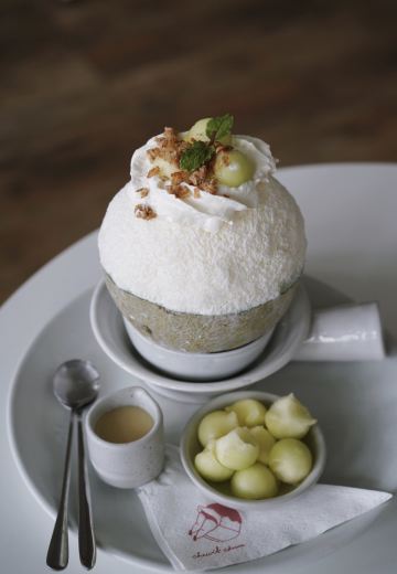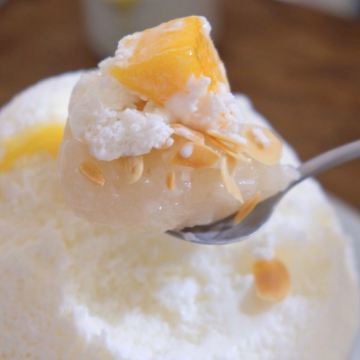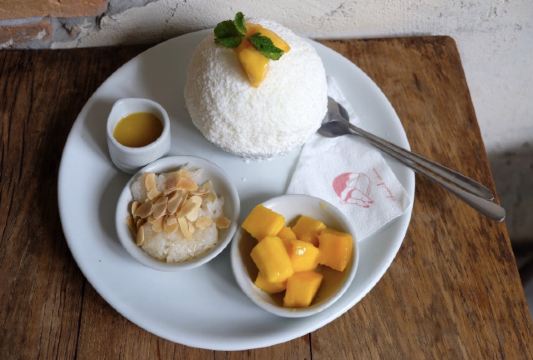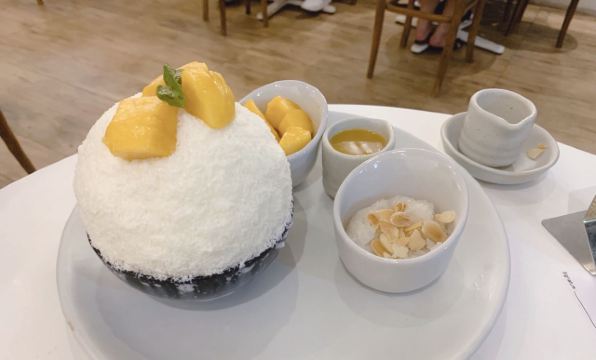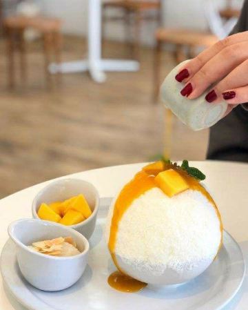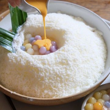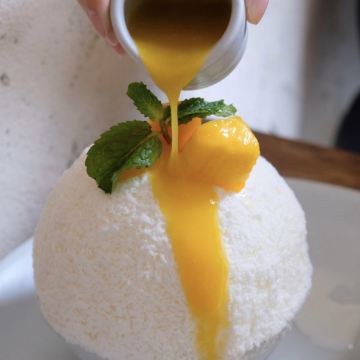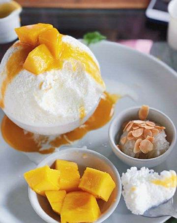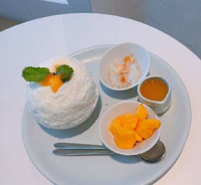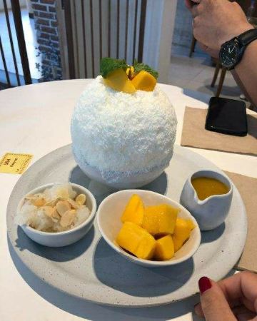 摆渡修行Cheevit Cheeva餐厅,来发这家在清迈吃到最喜欢的甜品店啦(虽然也不是吃了很多家)!我们中午12点多去到店里已经坐满人了,然后店员说珍珠奶茶冰和蜜瓜冰都没有! 215泰铢 等它制作等了有20分钟,分量不少,糯米饭、芒果、芒果酱和雪冰是分开的。雪冰口感超级绵软细腻,奶味很浓,但吃起来不会觉得腻。芒果大块鲜甜,除了这一碟芒果,雪冰底下居然还藏着有好几块,放上咸甜的糯米饭一起吃,口感很特别了! - 235泰铢 看到有咸蛋黄味的怎么可以不点,其实是给咸蛋黄酱和椰浆淋着吃,咸蛋黄味很浓,但把酱淋下去之后冰化得太快了,到后面就是像在喝糖水,彩色的小丸子也没什么味道,口感不够软糯。所以我更喜欢芒果糯米饭那份的味道!