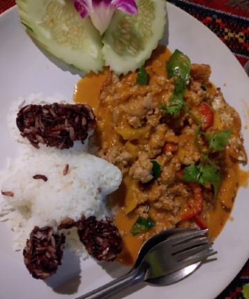 非常小的一家泰国餐厅,只有8张桌子,但胜在味道够正宗,量非常满,老板非常热情,价格更是便宜。店里布置的很温馨,有流水的声音,有书籍、有自行车、有电视、有躺椅,更有淳朴的味道,还有一只熟睡的大狗狗。到了中午餐厅的顶棚还会喷水来给食客降温。