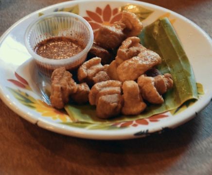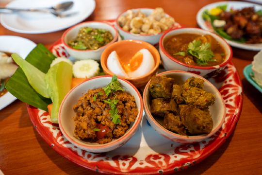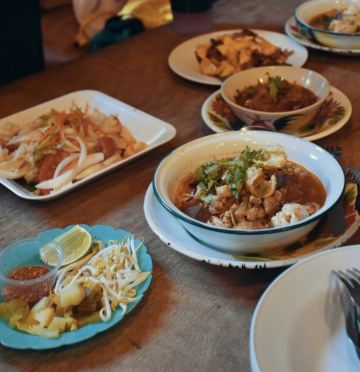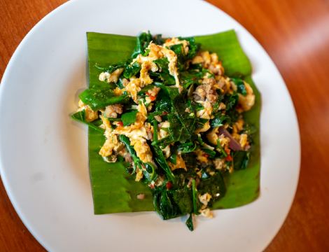 摆渡修行小众泰北菜馆,在一个看上去破破烂烂的院子里,在外面根本看不见,到了附近可以拿着店名和地址找当地人问一下。 前菜拼盘| 来店必点!包括猪肉咖喱|炸猪肉|茄子辣椒|香肠|西红柿炒蛋,一次尝遍泰北小吃。 猪肉咖喱| 作为泰北菜特色的猪肉咖喱当然不能错过,咖喱里的香料味更重,和我们认知中的咖喱差别很大,缺点是猪肉稍微有点硬。 炸猪肉| 酥酥脆脆,不会有人拒绝的磨牙小吃~ 茄子辣椒| 一口辣到上头,有点像湖南的烧椒擂茄子。 香肠| 街头经常会遇到的香料香肠,有点冬阴功味,超好吃超喜欢! 酸辣鱼汤| 喝起来大概是清爽偏酸版本的冬阴功汤,非常开胃~ 海鲜沙拉| 鱿鱼、虾、胡萝卜和西红柿简单拌一拌,不过生洋葱太多了实在有点上头。 泰北菜口味偏辣,基本不用椰浆调味,所以比起南边的柔和,要味道更清爽刺激些~