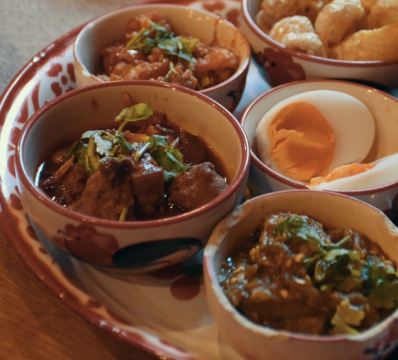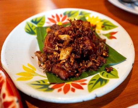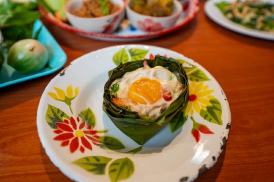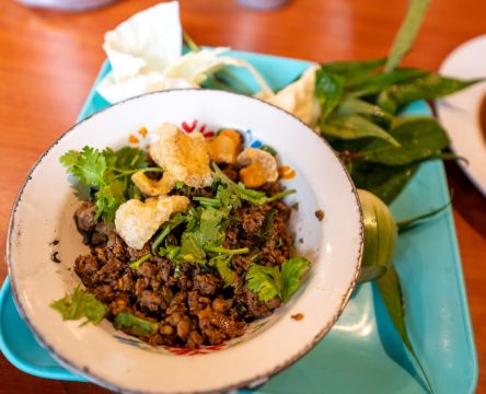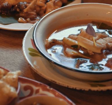 Han Teung Chiangmai小众泰北菜馆,在一个看上去破破烂烂的院子里,在外面根本看不见,到了附近可以拿着店名和地址找当地人问一下。 前菜拼盘| 来店必点!包括猪肉咖喱|炸猪肉|茄子辣椒|香肠|西红柿炒蛋,一次尝遍泰北小吃。 猪肉咖喱| 作为泰北菜特色的猪肉咖喱当然不能错过,咖喱里的香料味更重,和我们认知中的咖喱差别很大,缺点是猪肉稍微有点硬。 炸猪肉| 酥酥脆脆,不会有人拒绝的磨牙小吃~ 茄子辣椒| 一口辣到上头,有点像湖南的烧椒擂茄子。 香肠| 街头经常会遇到的香料香肠,有点冬阴功味,超好吃超喜欢! 酸辣鱼汤| 喝起来大概是清爽偏酸版本的冬阴功汤,非常开胃~ 海鲜沙拉| 鱿鱼、虾、胡萝卜和西红柿简单拌一拌,不过生洋葱太多了实在有点上头。 泰北菜口味偏辣,基本不用椰浆调味,所以比起南边的柔和,要味道更清爽刺激些~