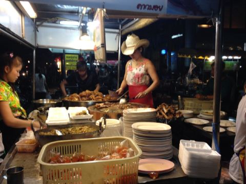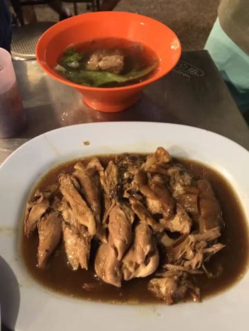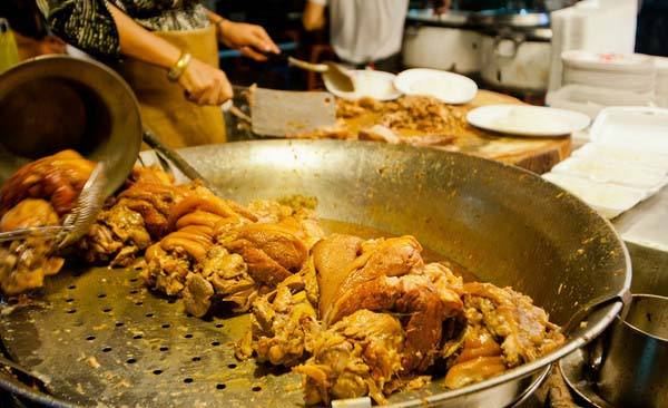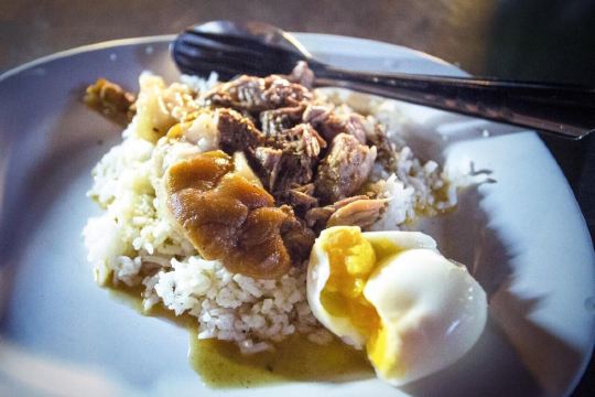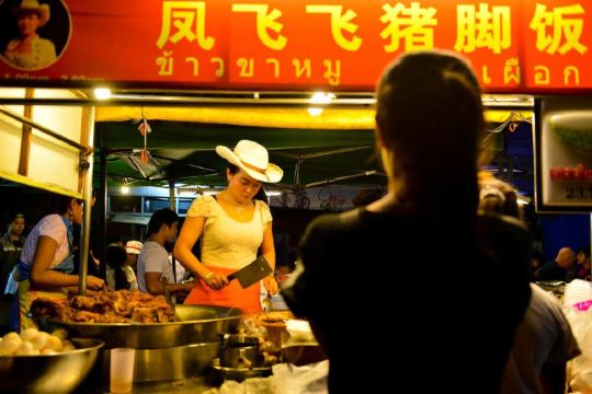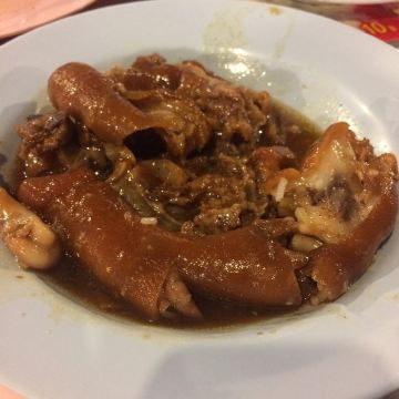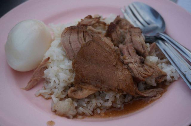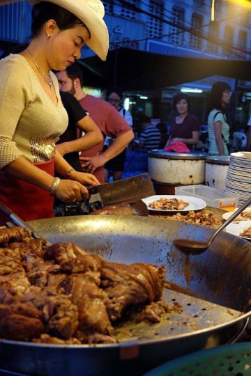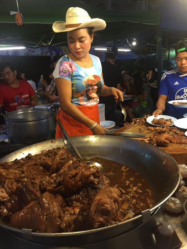 这是清迈首屈一指的猪脚饭,因为美女老板娘神似凤飞飞,于是天天戴着牛仔帽形成了招牌。小摊位置在清迈北城门昌卜克夜市,到晚上才慢悠悠的出摊,一盘美味的猪脚饭物美价廉,猪脚炖的肥而不腻,汤汁稀而不淡,美味非凡,猪脚饭除了猪脚还搭配了酸菜和一颗半熟蛋。
