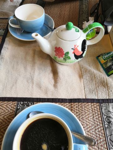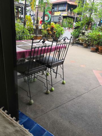 在古城逛寺庙来的,去了帕辛寺、契迪龙寺(大佛塔)。走累了想找个地方歇脚,一眼看到了这里,一家兼营泰国菜的咖啡屋。不到饭点只要了咖啡和茶。后来知道是家网红店,环境不错吸引了不少欧洲客,邻桌的一对欧洲情侣还相互在对方的盆子里舀食狂秀恩爱呢。