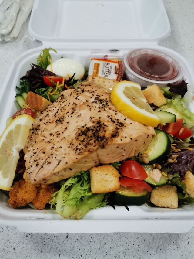 还是三文鱼沙拉最好吃, 无油, 还有高蛋白, 不错。 里面有蔬菜, 煮鸡蛋, 还有一块三文鱼 yumny