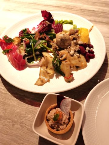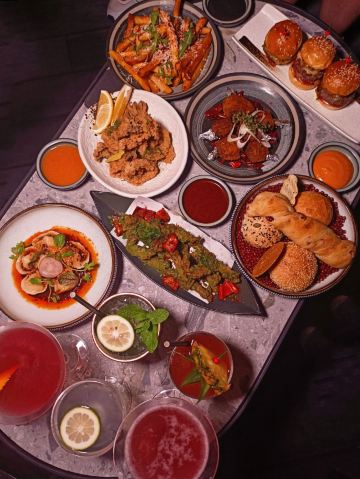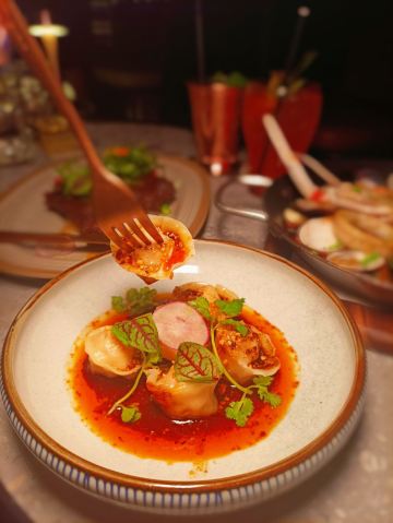 川香烤鸡腿,重庆龙虾抄手,冰鲜海鲜塔,川香炸鸡,烟熏三文鱼甜筒,海鲜饭,鸡尾酒,小汉堡,白葡萄酒,猪肉虾泥腐皮卷