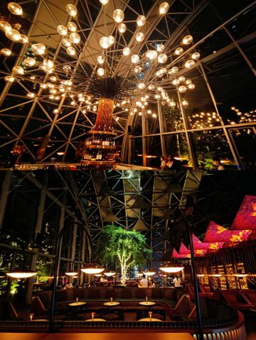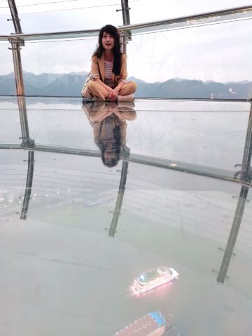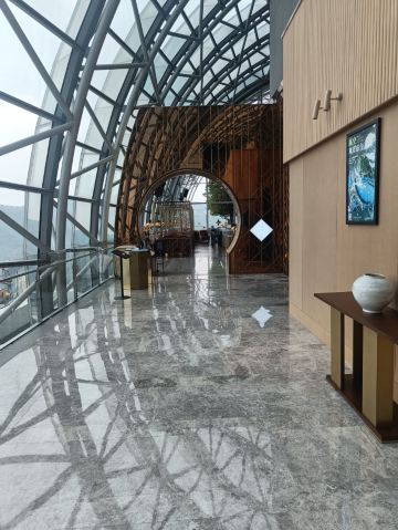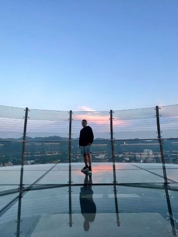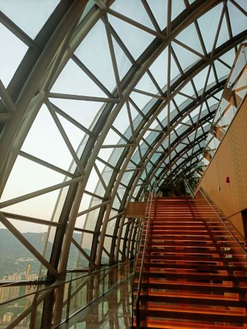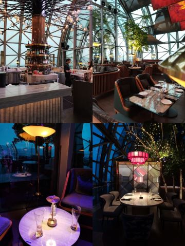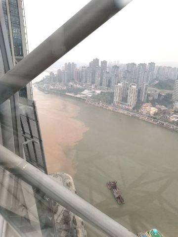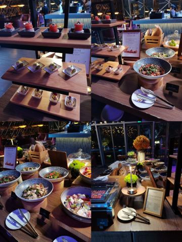 喜悦的帽子姐姐耍吧在重庆地标建筑来福士水晶连廊42楼上,到这里吃饭就是奔着环境和氛围去的。我们一到这里就直奔玻璃平台,隔着透明玻璃,从200多米的高空观赏长江和嘉陵江,还有来往的游轮和车辆,特别刺激。恐高症患者都不敢往下看。在这里可以看到两江交汇,像极了重庆火锅的鸳鸯锅。 装饰风格融合了现代时尚和自然元素,室外有很多绿植,很浪漫。 我们点的主厨精选特惠套餐,海鲜塔、战斧牛排摆盘很惊艳,味道中规中矩。最后上的甜品巧克力味道很正,虽然在减脂期,也忍不住吃完了。印象最深的就是自助沙拉吧,品种太丰富了,完全吃不过来,拿了一个小点心特别好吃,但不知道名字。 本次人均花费1000左右(含酒水),在这里就不要讲性价比了,图的就是氛围和感觉。 整体消费体验还是不错的,不过这里适合约会,不太适合商务,我们点的菜都是单份,又不提供分餐,人多,桌子太长,好多菜够不着。 服务员挺好的,需要充电,很热情的帮把手机放到吧台去了。 不过这里洗手间设计不合理,标识不清楚,男士要下一层,撞到有男士误入女洗手间,还好及时发现了。 位置不好找,我们在来福士商场里绕了快半个小时,才找到通往水晶连廊的直达电梯。 交通还算便利。