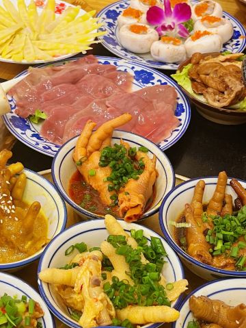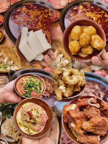 蒜香排骨,姜丝牛肉,招牌卤香耙鸡脚,耙芋儿,酥肉,麻辣火锅,鱼籽虾滑,百香橙橙,烧椒皮蛋圆子,紫芽苹果,虾滑,鲜果炒冰,皮蛋圆子,手工午餐肉,咖咖火锅