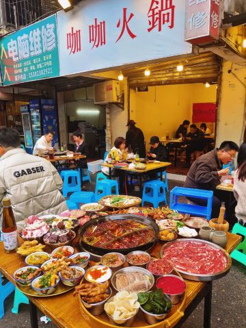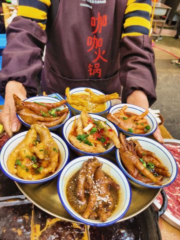 不会只有我吃火锅不爱毛肚鸭肠爱鸡脚吧? 咖咖火锅的鸡爪真的是绝了 每种口味都打在我心巴上,七种口味(经典耙鸡脚 蒜香耙鸡脚 西红柿耙鸡脚 泰式酸辣鸡脚 咖喱爬鸡脚 风味豆豉耙鸡脚 黑胡椒耙鸡脚),一点不夸张,每种都很喜欢,主打就是一个软烂耙 还有香菜贡菜牛肉,蘑菇虾滑,都融合的超好吃,好喜欢这些新菜品带来的惊喜😭 环境:正宗的社区老火锅,生意超级,但是桌数很多,排队轮的还蛮快的,推荐推荐