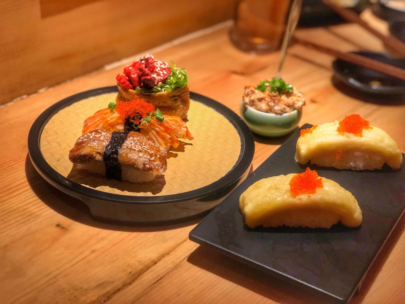 脆皮肥肠,大虾一口饭,赤烧地狱拉面,餐前豆腐,榴莲芝士,脑花寿司,鹅肝一口饭,鹅肝寿司,酥皮脑花寿司,牛肉一口饭