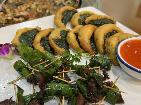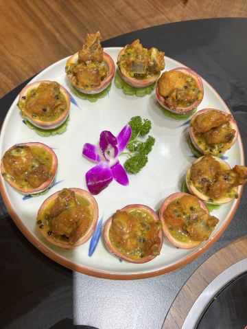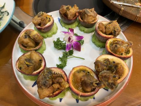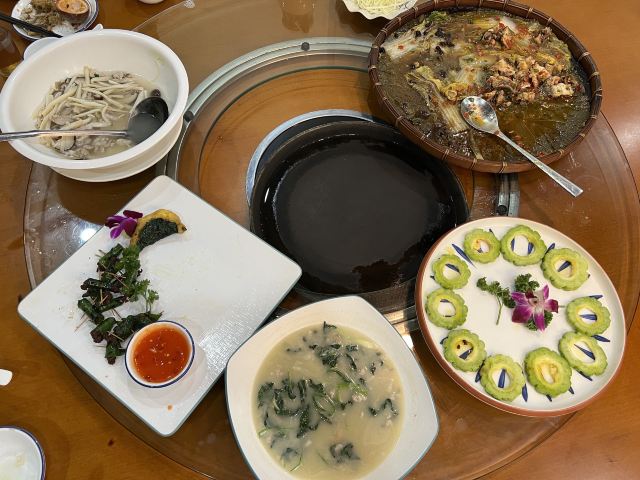 香叶双拼,风味牛杂,蚬肉生菜包饭,上汤野菜,百香果排骨,簸箕鱼,鸡皮果豆腐,香煎黑米粽4片半份,壮乡紫苏炒田螺,藕饼蒸肉,鸡皮焖豆腐,五谷杂粮包,椒盐扇子骨