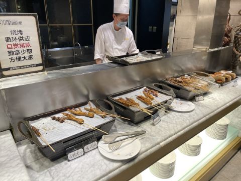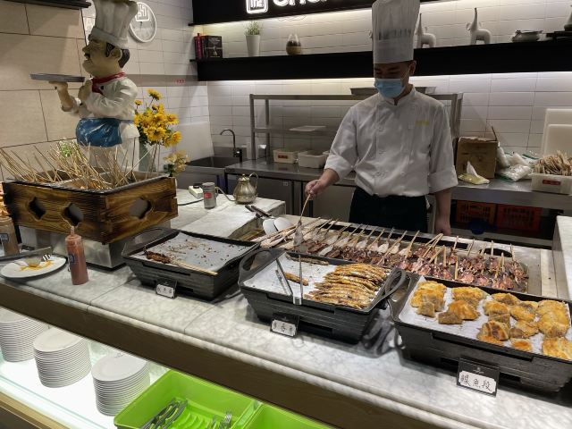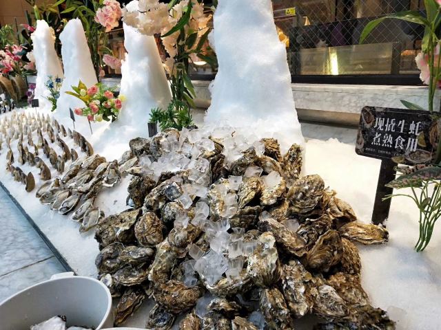 三文鱼,黑蒜烤生蚝,鲍鱼,北京烤鸭,百香果汁,扇贝,羊肉串,小龙虾,寿司,水果,锅包肉,海鲜葱饼,慕斯杯,烤鸭,烤羊排,牛百叶