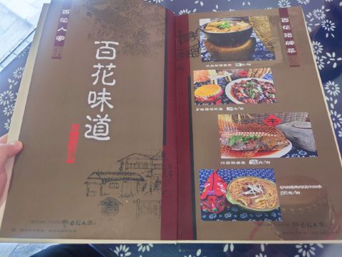 百花人家装修设计下了十分功夫,马路一侧是两层农家院,墙上很多明星用餐的照片,客人也可以在房顶用餐,另一侧是自建的水榭,可以在水上竹棚里用餐。方圆百里这么小资的装潢相当出众。 这里是很好的一家农家馆,干净卫生,价格实惠,量也足。