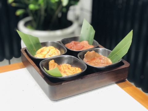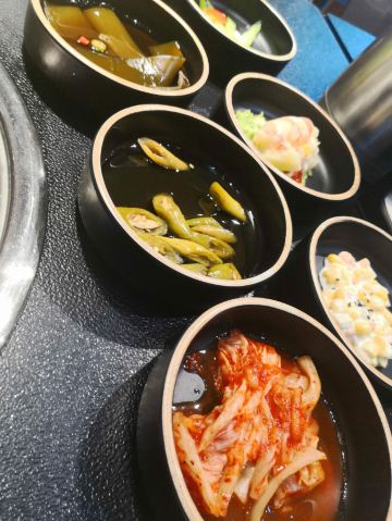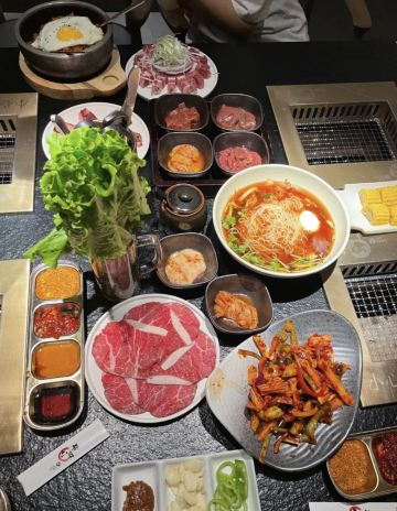烤鲜牛大肠,烤牛内脏拼盘,特色嫩牛肉,气泡冷面,秘制牛胸口,口蘑,蘸料,石锅辣白菜炒饭,山葱与山葵猪五花,炭烤鲜黑牛牛肚,烤肉,烤猪五花,牛内脏,烤鲜牛肚