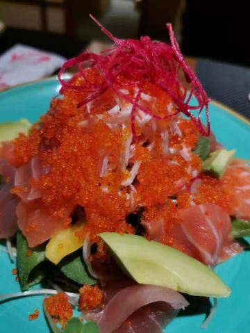 牛油果黎麦沙拉,寿喜锅,香煎鹅肝,杏仁豆腐,最爱金枪鱼反包卷,松茸汤,刺身拼盘,皇冠三文鱼刺身,蒲烧活鳗鱼,金枪鱼