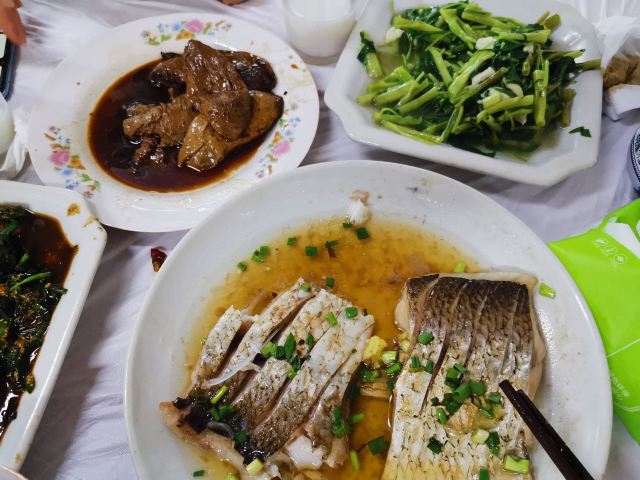老鹅茭白汤,鱼头粉皮,清炒韭菜,东坡肉,脚圈,白虾,大蒜炒鱼子,红烧肉,鸡汤(半只),韭菜,酱爆螺蛳,白鱼,洋葱鳝丝