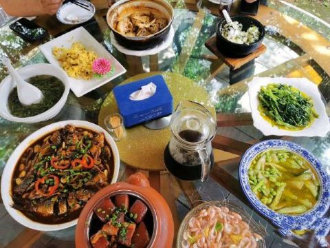 我曾爱过你1314东山镇上很不错的一家农家乐,店非常大,就是去的时候是枇杷采摘季节路太堵了,开了一一个早上的车,到店正好还有一桌空位,我们马上就入座了。 点了一品砂锅鸡,银鱼炒蛋,清蒸白鱼,炒苋菜,桂花桃花羹,咸肉菜饭,菜品丰富,老板娘推荐自己酿的酸梅汤也点了一壶,酸甜爽口,砂锅鸡好吃的,肉嫩嫩的腌制过,有点类似酱肉的味道,香喷喷,银鱼炒蛋和白鱼也很可口,他家菜都是用菜籽油炒的,黄灿灿的颜色很香,甜品是桂花桃胶羹,甜丝丝桂花香浓郁,桃胶都沉在底下还有苏州的特色红绿丝点缀,个人觉得这个味道如果里面能再加点酒酿,就更绝啦。 总体是不错的一-次拔草,有好多外地来的旅客也在等位吃饭,人多的话建议提前预订,特别是包厢和大桌,因为生意真的很好。