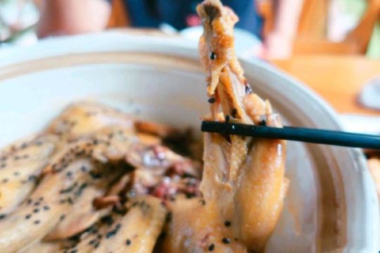 YoYo_0I0A4Q6V周末东山一日游。。。去年和小伙伴们一起吃过。这次领导请客,主动推荐了这家。路边停车挺方便的。进门是一-片桃花林,开放式的环境,树下,伞下皆可入座。吹着风,吃着饭,好不惬意。 领导们都在,随便拍了几张。-品焖锅鸡,鸡肉放在砂锅里炖的软烂,再撒上一层黑芝麻,超级无敌巨香。外婆红烧肉,肉质鲜美,肥而不腻,我看到领导吃了好几块,应该是喜欢的。 咸肉菜饭一直是我的最爱。肉的咸香,菜的清香,再加上一点点锅巴的脆香,我吃了一碗, 都在调侃我不吃饱哪有力气减肥,然后果断又盛了一碗。 领导们都夸选的地方好,环境美,吃的舒服,看样子今年奖金不会少了6