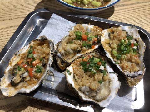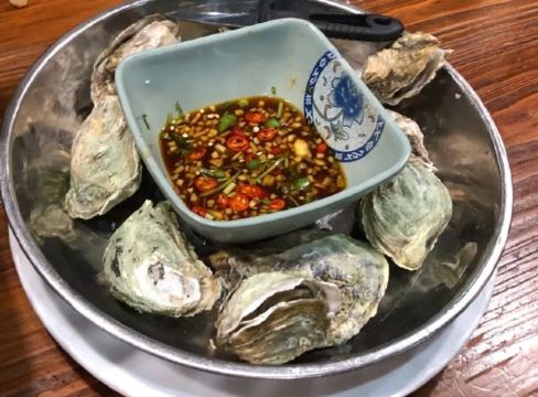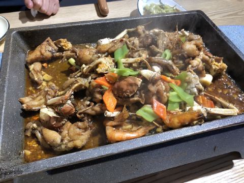 周末晚上5点,不用排队,座位也比较多,不过没开空调,坐着感觉好冷。 炭烤牛蛙湖蟹,要了微辣的紫苏口味,牛蛙量多,而且大部分都是牛蛙腿,煮久一些更入味,不过牛蛙是油炸过头了点,炸的时间短一点,牛蛙肉会更嫩更好吃。湖蟹切块,放了不少,还有明虾,土豆和莴笋。 炭烤生蚝,一定要趁热吃。四只生蚝,每只个头都很大很肥,质量很不错哦。