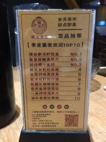 YoYo_4S6C1R1D♫ |地点| 位于珠江新城花城大道84号优托邦1座4楼409-5号(2号唐厨楼下) ♫|环境| 不知道为什么当时店里有一股不太好闻的味道 室内以灯笼和竹子作为装饰,有种返璞的感觉 自然而又不含过多吊饰 ♫|服务| 点了小青柑,第一次尝试,味道还不错,名字听起来很有夏日feel 套餐内容:78元扶墙走,完全够三人行 「禄运金牌虾饺皇」 28元  虾饺好吃好吃非常好吃,真不愧是季度最受欢迎的菜品TOP1 馅非常丰富,满足 「酱皇豉椒蒸凤爪」 25元  榜单TOP2,蒸得挺软的,酱皇豉椒的味道不会太呛口 「脆皮有机红米肠」 25元 榜单第四名,太久没迟到红米肠了,差点忘了它的味道 这一尝,马上把所有味蕾的记忆都勾起来了 推荐必点 但是只有一条菜心也是醉了 「咸香鸡丝鱼茸粥」 18元  鱼茸粥感觉比较考究师傅做鱼茸的手工 没有骨头,粒粒真香 「禄运脆皮葱油饼」 15元  觉得吃点心就应该吃清淡的,所以对于油腻腻的脆皮葱油饼喜欢不起来 「云南小瓜金钱饺」 18元  肉馅非常多,吃不太出云南小瓜的味道 「滋补美颜红枣糕」 18元  看着样子就觉得很滋补 红枣糕不会太甜腻 茶位 2位 16元