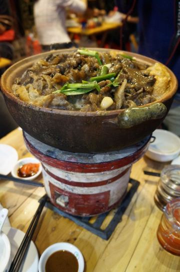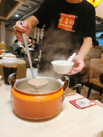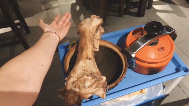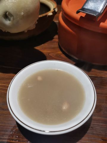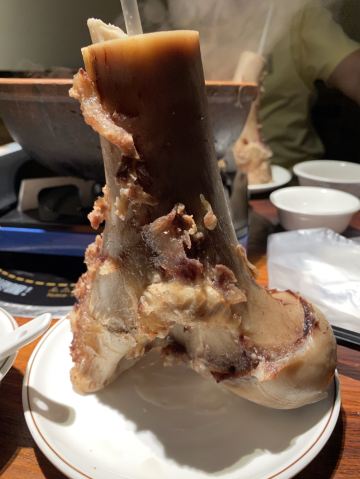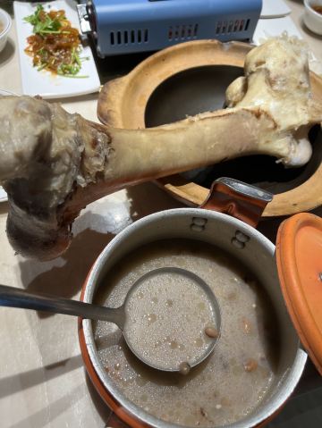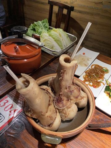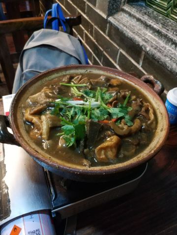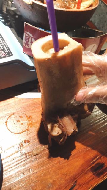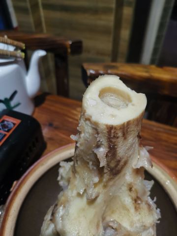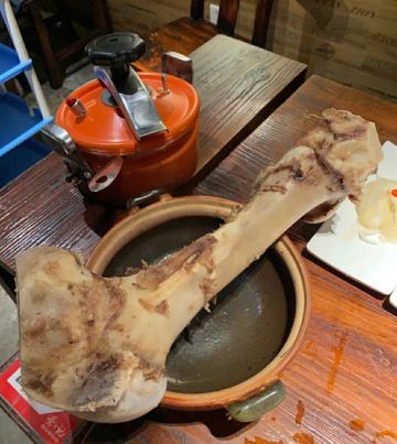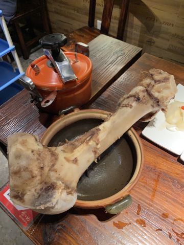 GongJi Niugu Niuzawu (TiYu Xi)拔草龚印记牛骨牛杂屋。 这顿午饭环境同出品充满市井气息但吃得好过瘾。 牛🐂杂屋位于天河体育西横路。门面窄窄的并不起眼。里面是长条形的共两层。提前预订被安排在二楼,免却了排队之苦。 吱吱吱......的声音拉开这顿关于🐂的午餐的帷幕。声音来自一个小型高压锅,里面是喝一口就不想停下来的百岁奶奶牛骨🦴汤(28)。 然后是卟卟卟沸腾着的精品牛杂煲(小煲158)。这个煲好有内涵,上面是牛筋、金钱肚、草肚、牛肠、牛腩等;下面是冬菇、面筋和萝卜。另外再配三款新鲜疏菜。材料够新鲜,口感和味道都是杠杠的。 最好玩的是那根网红巨大筒骨(38)了,它竟然跟俺的手臂一样粗。这根巨骨上桌前已捱了电锯一下子,然后在店员的辅助下由食客执锤把它一分为二。灌入少量百岁汤就可以连汤带骨髓一起吸食了。骨髓的滋味又有谁能拒绝呢。 服务是真的很到位。进出时遇到的每个员工都会主动打招呼🙋♂️。需要他们协助的时候都会及时出现。 龚印让我记住了三个一,一碗百岁汤、一煲精品牛杂和一根巨骨。