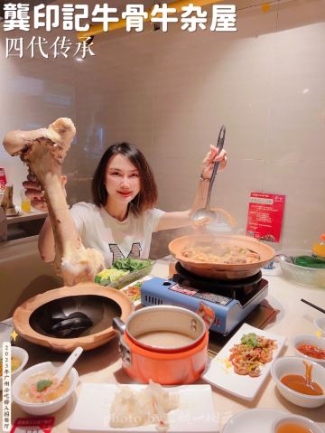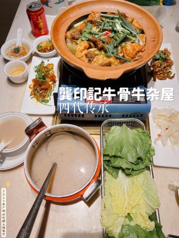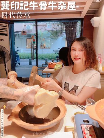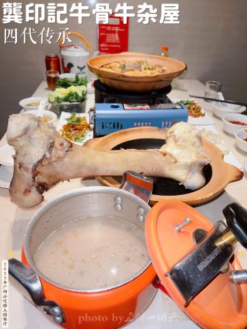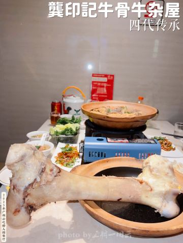 alicezmy拔草龚印记牛骨牛杂屋。 这顿午饭环境同出品充满市井气息但吃得好过瘾。 牛🐂杂屋位于天河体育西横路。门面窄窄的并不起眼。里面是长条形的共两层。提前预订被安排在二楼,免却了排队之苦。 吱吱吱......的声音拉开这顿关于🐂的午餐的帷幕。声音来自一个小型高压锅,里面是喝一口就不想停下来的百岁奶奶牛骨🦴汤(28)。 然后是卟卟卟沸腾着的精品牛杂煲(小煲158)。这个煲好有内涵,上面是牛筋、金钱肚、草肚、牛肠、牛腩等;下面是冬菇、面筋和萝卜。另外再配三款新鲜疏菜。材料够新鲜,口感和味道都是杠杠的。 最好玩的是那根网红巨大筒骨(38)了,它竟然跟俺的手臂一样粗。这根巨骨上桌前已捱了电锯一下子,然后在店员的辅助下由食客执锤把它一分为二。灌入少量百岁汤就可以连汤带骨髓一起吸食了。骨髓的滋味又有谁能拒绝呢。 服务是真的很到位。进出时遇到的每个员工都会主动打招呼🙋♂️。需要他们协助的时候都会及时出现。 龚印让我记住了三个一,一碗百岁汤、一煲精品牛杂和一根巨骨。