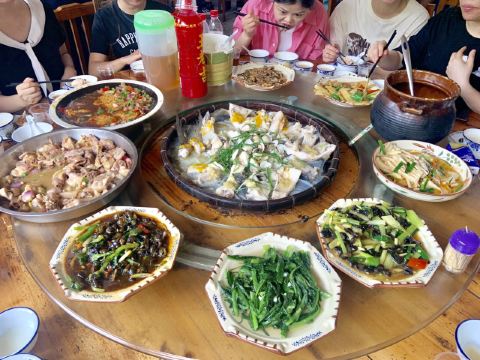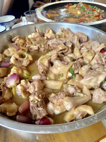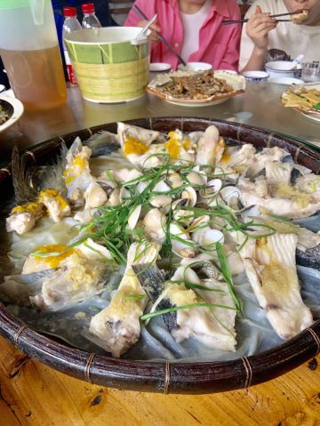 环境: 到了亲近大自然的地方,对用餐环境要求就没那么高,农家菜馆装修都比较接地气,不过桌面清洁不是太到位,刚坐下的桌面都比较油腻腻… 服务: 没有太多服务,前面上的都是素菜,大菜都在后面上 竹盖鱼 红葱头蒸鸡 紫苏炒山坑螺 山坑鱼 都比较推荐,鱼🐟和螺都没有泥味,也很新鲜。比较地道的紫苏炒螺,比较要尝尝。 农家红糖糕 看着卖相不太行,吃着很不错,甜度刚刚好,有点Q弹韧劲