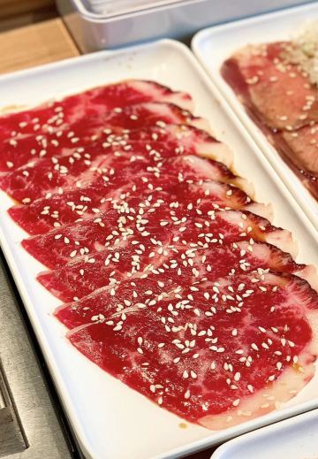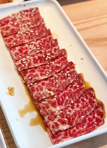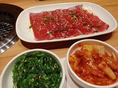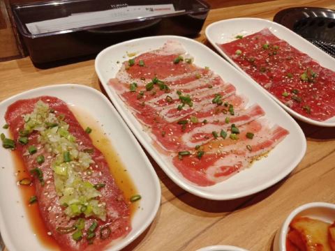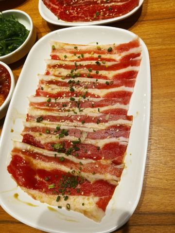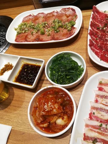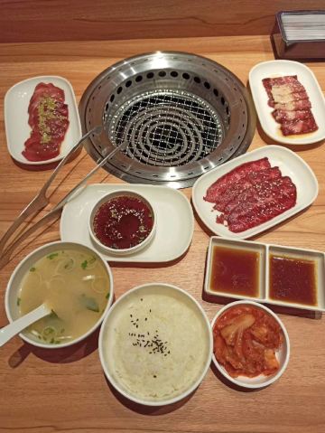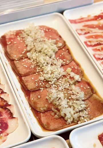 hj****70特上牛五花,脂肪多d,6-7片,烤个阵时出油比较多,但系有脂肪比较滑。 盐葱牛舌,8片左右,圆圆地一片,烤熟后无点收缩,牛舌口感爽滑,肉质有弹性。[爱][爱][爱] 赤坂泡菜,细细一碟仔,唔会好辣,有d甜味,用来夹烤肉一齐食可以祛油腻。[惊叹] 日式裙带菜,呢个就一般无咩特别。 越光米饭,圆碌碌米饭,都系早前装定好一碗碗,有单就直接上,预先装好有利上菜快,不过d米饭就唔热了。 |白贝味噌汤,有豆腐粒海草,唔会好咸。 |一人配左一份调味料,一格豉油一格五味粉。 两个人食分量唔多够,再加多一套,又系三碟肉,米饭同小菜就唔要。 特上豚五花,系团购餐变成左豚五花,肉细片d,不过烤熟无点收缩,相比牛五花,豚五花脂肪明显少,瘦肉多,所以口感就鞋d。
