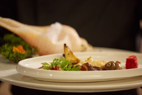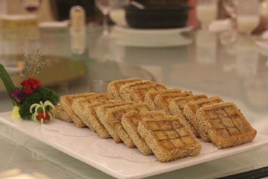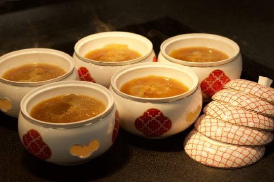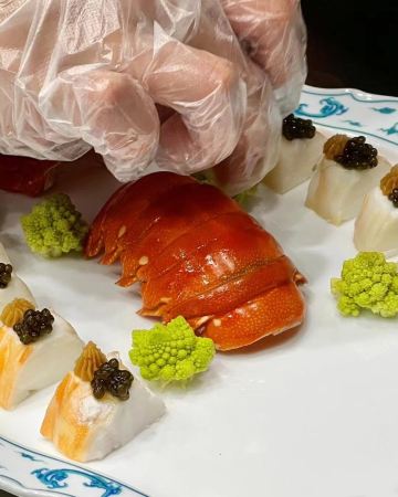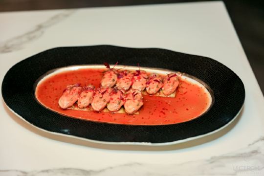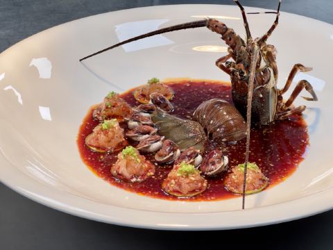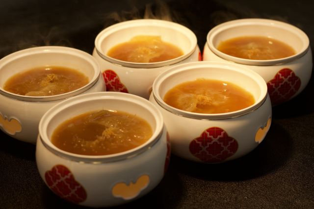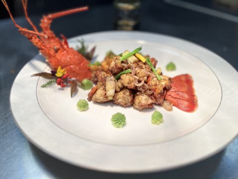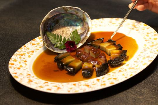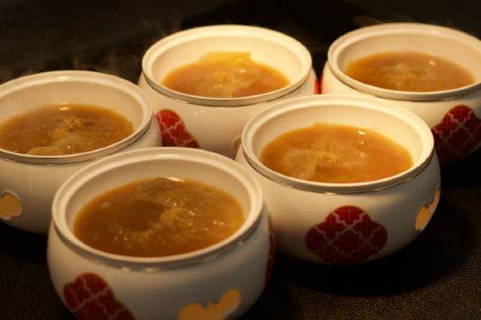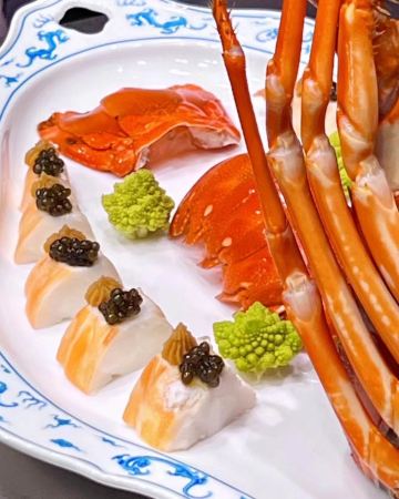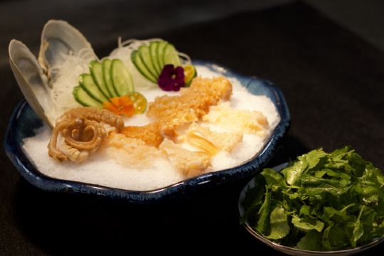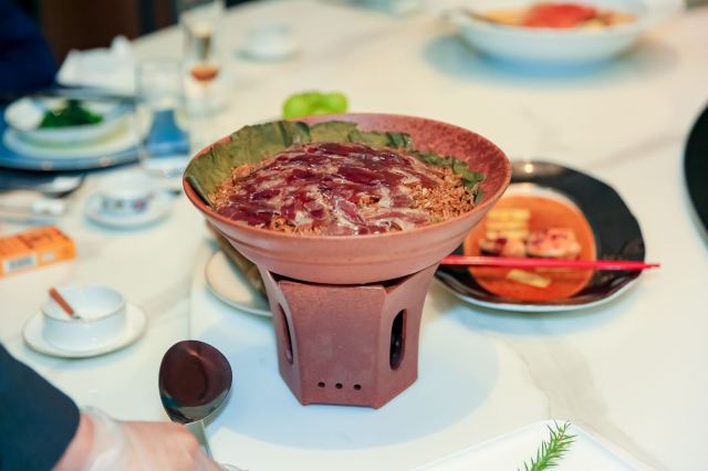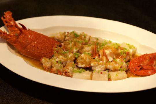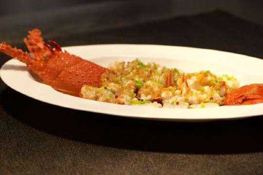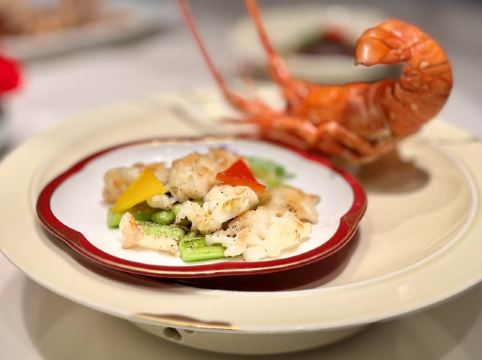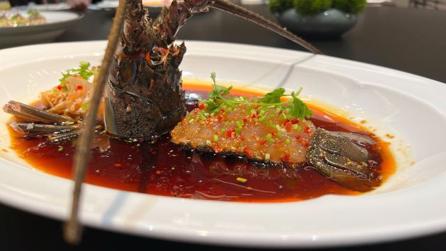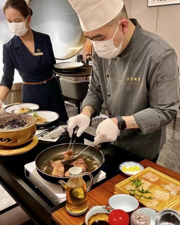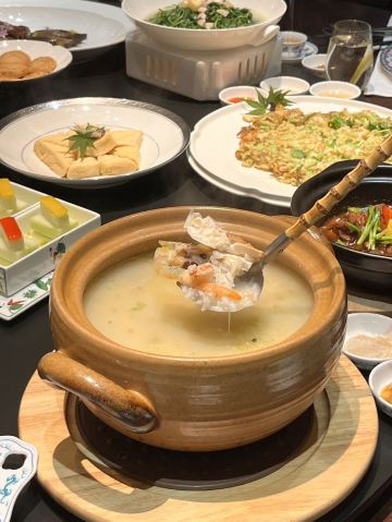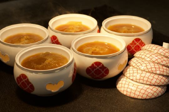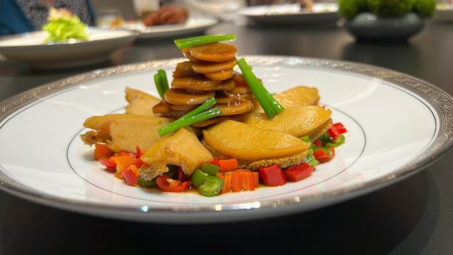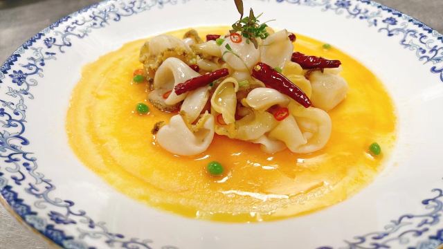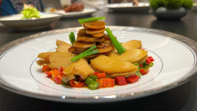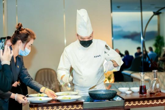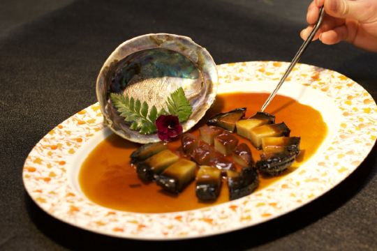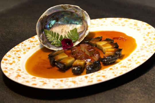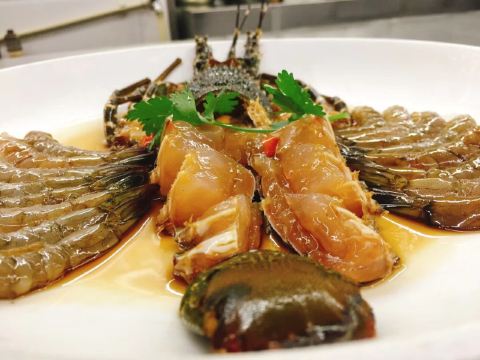 脆皮金沙参,明炉炭烧响螺,48个月潮州卤老鹅头,港式花胶扒,炭烧澳鲍,冻红蟹,48个月卤水老鹅头,生腌膏蟹,潮味花胶扒,潮式花肚扒,红桃粿,黑椒牛籽粒,冻马友鱼