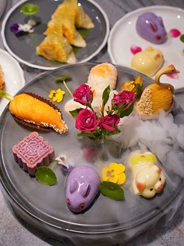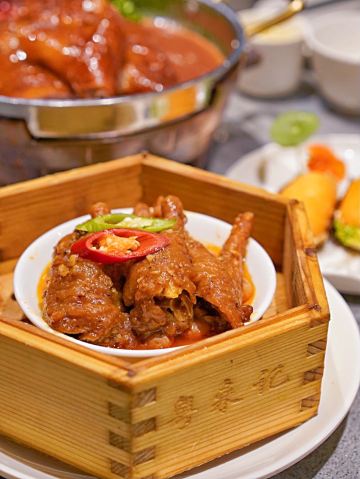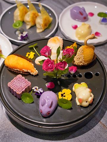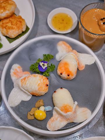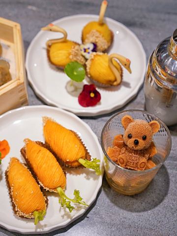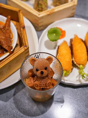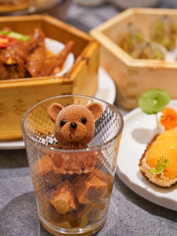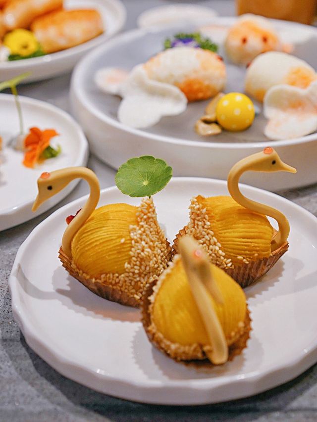 加油干饭呀粤来记绝对是颜控们的快乐星球,每一道点心都是糖衣炮弹,狂轰滥炸你的少女心💓 大开吃戒之前,先来给小熊洗个香香的奶茶浴吧,乖萌乖萌的🧸熊仔奶茶🧸,丝袜奶茶醇香顺滑,奶茶精表示爱了爱了❣️ 🍗深井烧鹅🍗自然是每桌必点先到先得,烧鹅外脆里嫩肥香不腻,蘸上酸甜适口的梅子酱,好吃到停不下来的节奏。 竟然还能“蟹”逅🦀️桥底辣蟹🦀️, 有钳任性的必食之选,外表金黄酥脆蟹肉鲜中带辣,是蒜香、豆豉和辣味的完美合体。 小仙女面对蟹钳往往束手无策,粤来记贴心地提供拆蟹服务,解放双手尽情享受美味吧~ 🍤红米脆皮肠🍤真材实料用实力说话,每一段都紧裹饱满大虾,集酥脆软糯于一体,一口一个直呼过瘾。 🐡芒果小金鱼🐡仙气飘飘C位出道,胖嘟嘟圆滚滚楚楚动人,软糯Q弹的雪媚娘冰皮,新鲜芒果粒伴随幼滑奶油,真是欲罢不能~ 栩栩如生的🥕胡萝卜🥕,酥脆掉渣的千层起酥,包裹清甜爽口的萝卜丝,层次丰富妙不可言。