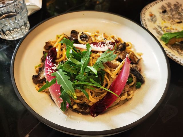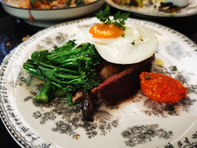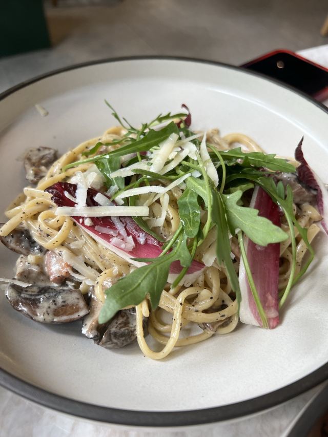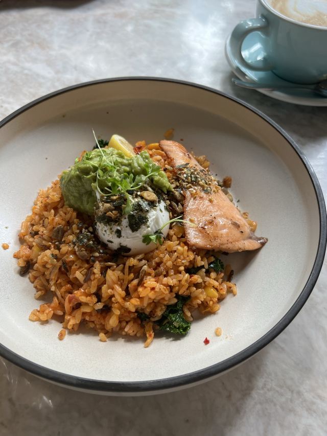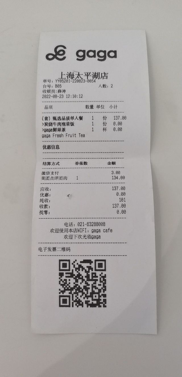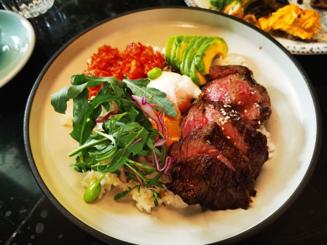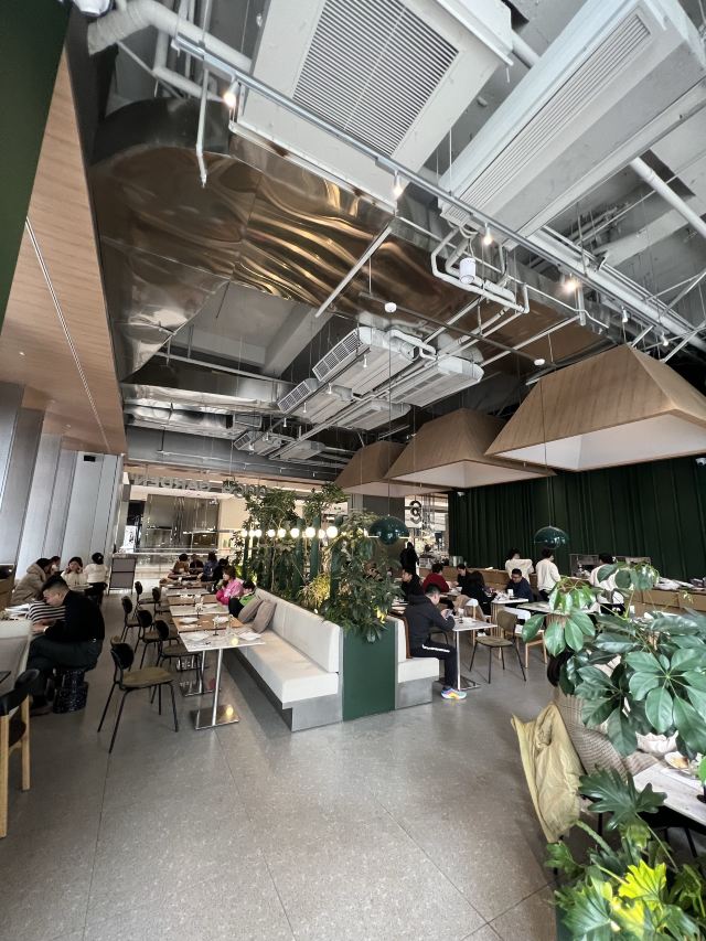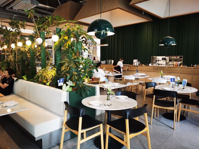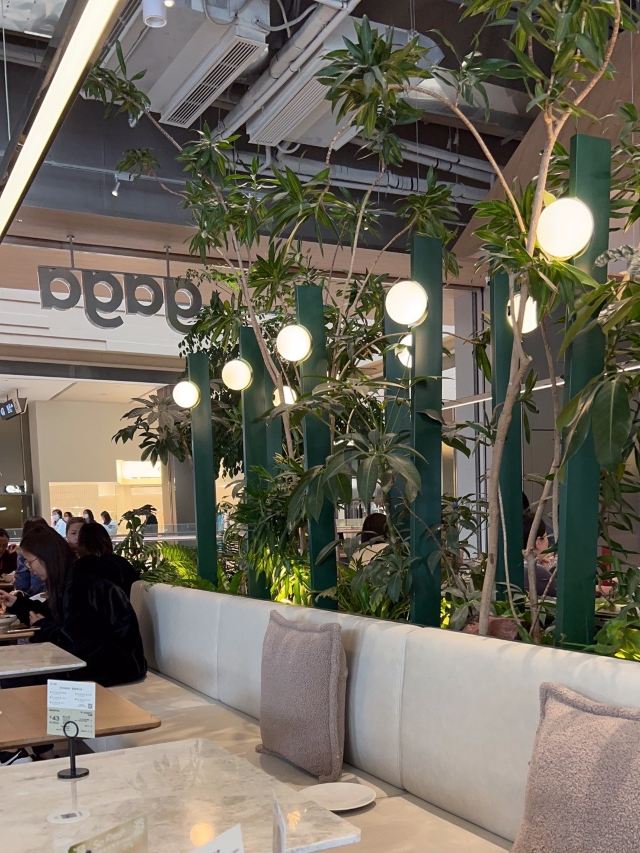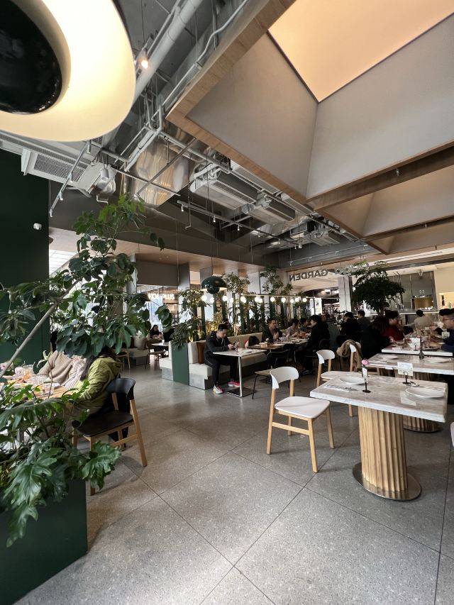 食神牛朋友中了免费试前去体验,店铺开在商场的一角,敞开式的店面用绿植做了间隔,座位蛮多有室外露天位。 接待蛮热情引领就坐倒上柠檬水,扫码点单也可让店员下单。送餐前小食玉米片。 免费试套餐有香煎薄牛排、花园大早餐和两杯饮品,虽说是薄牛排其实厚度还可以,牛排味道香咸不是很嫩,上面盖着太阳蛋,配了芥蓝、土豆、菌菇。早餐蛋很嫩滑吐司香脆,培根有点焦略咸香肠酥润,配了番茄、牛油果、芥蓝、黄豆。燕麦拿铁拉花一般味道蛮香醇。 健康能量午市套餐98元炭烧泡菜牛肉饭也配有牛油果,盖了芝麻菜、温泉蛋,牛肉蛮酥嫩多汁,米饭要拌了泡菜才比较有味道。gaga鲜果茶有西瓜粒、草莓粒、柠檬片等,酸酸甜甜冰爽可口,因为意外打翻了,店员小妹给补了一杯。 味增松露窄意粉88元(微信加会员优惠5元)意粉柔滑火腿偏咸,松露味蛮重味增奶油酱汁浓郁。 草莓乌龙36元草莓酸甜带点茶香,青柠檬薄荷茶32元薄荷清香青柠酸爽。 餐点的味道还是蛮好的,分量也比较足,环境也蛮舒适,服务员比较少虽然添水蛮及时,但是跟不上客人的需求,厨房出菜比较慢时有错漏,点菜的时候最先要的汉堡没有下单,店员收银操作也比较生疏,问了几次店长才解决收款问题,结果分了三张小票,搞的我们停车费不能全部抵扣。