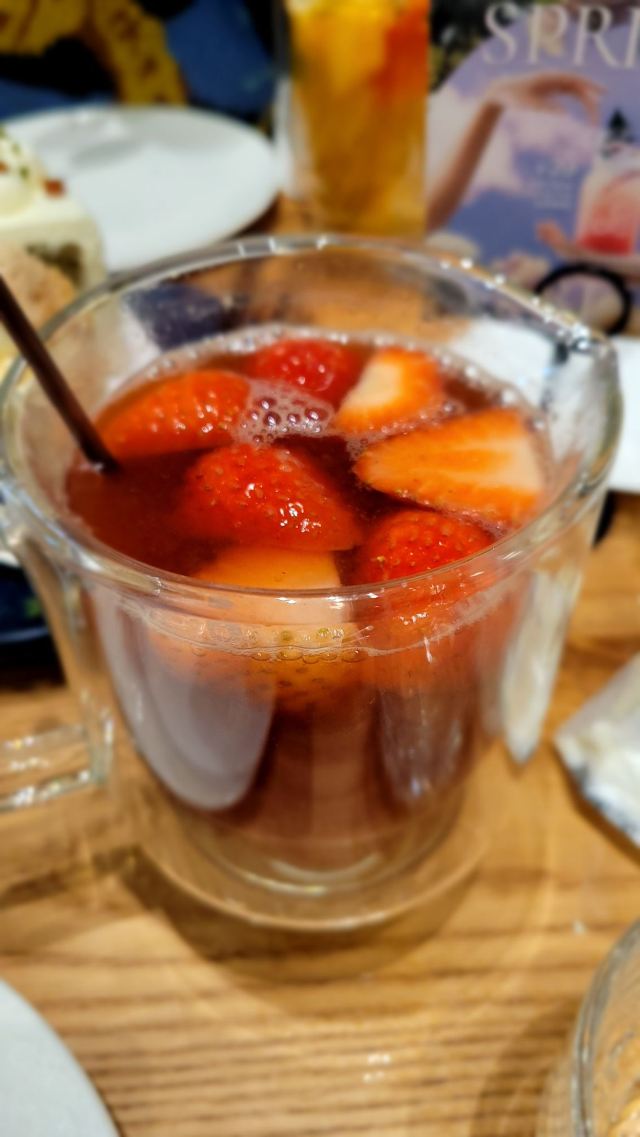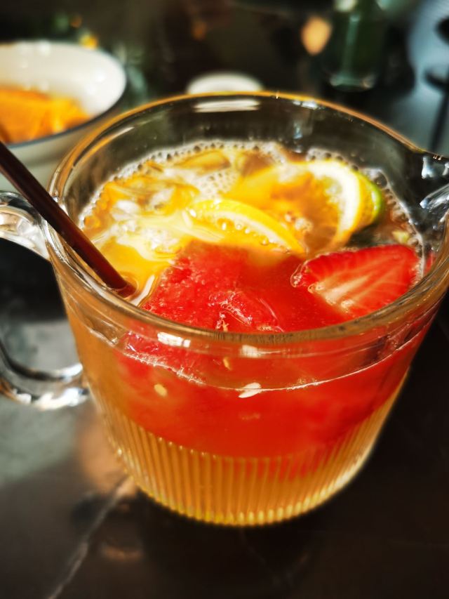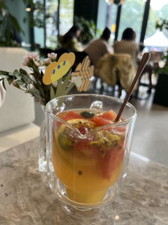 gaga鲜果茶,泡菜牛肉饭,花园大早餐,水果茶,香煎薄牛排,薯条,谷饲牛肉沙拉,烤春鸡,蒜香烩虾,烤南瓜沙拉