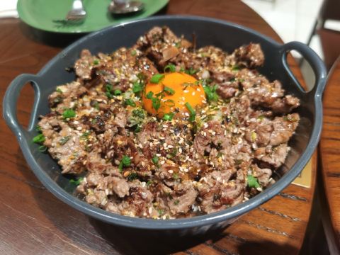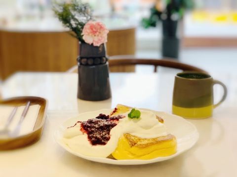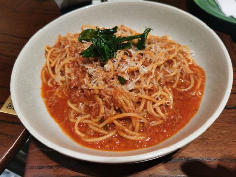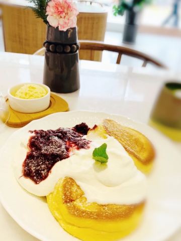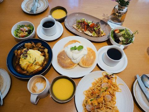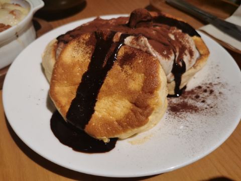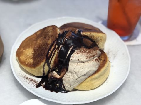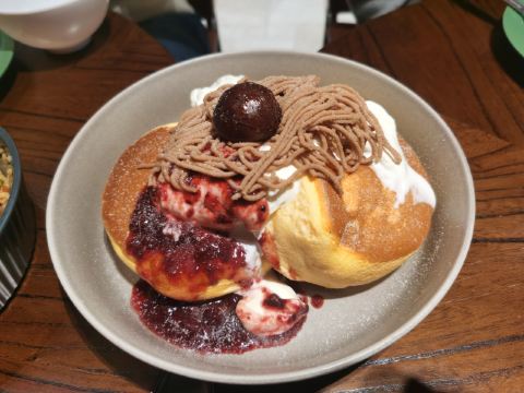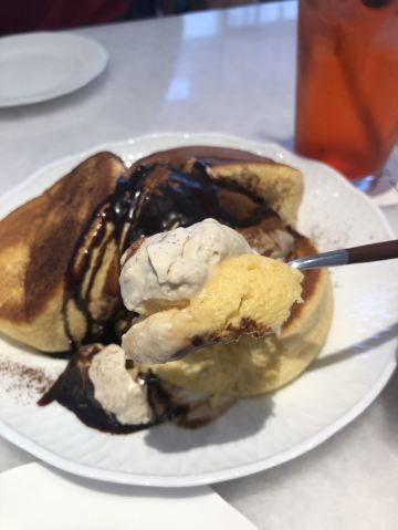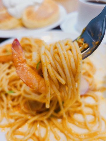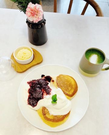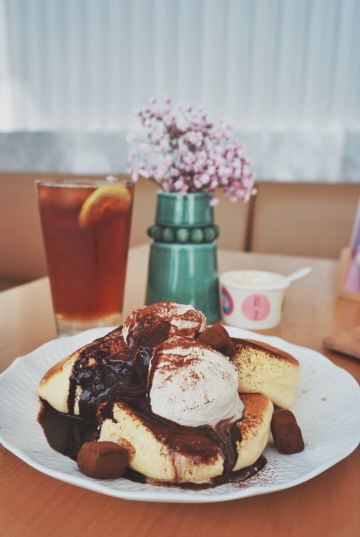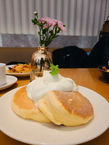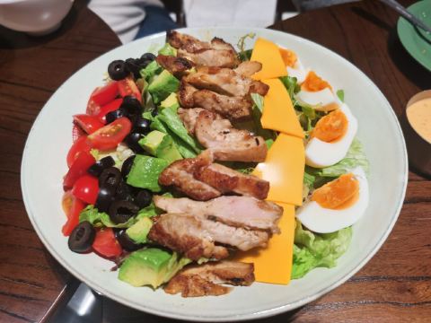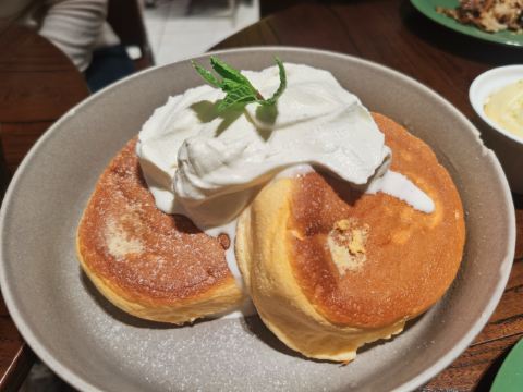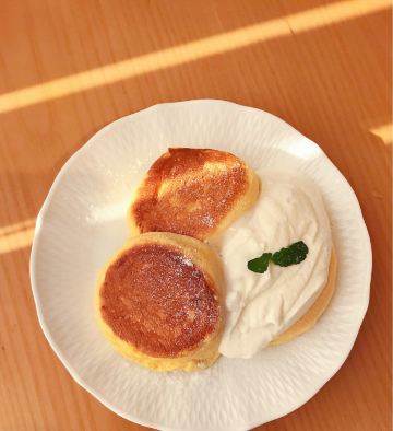 食神牛冲着他家舒芙蕾去的,工作日晚上没有排队,店堂不是很大都是小桌,只有一张大点的六人桌,四个人拼了两张小圆桌坐的不算舒适。店堂文艺绿植布置清新自然。 接待蛮热情安排就坐倒上柠檬水,提示扫码点单送上餐盘。先点了肉酱意大利面78元垫垫饥,意面口感比较软柔,肉酱多汁酸鲜咸浓芝士飘洒。 葱烤牛排饭88元牛肉铺满烤的微焦酥松柔嫩,芝麻葱香烧汁鲜甜。 原味舒芙蕾松饼(加料冰淇淋)80元鲜奶慕斯覆盖,松饼绵柔松化、蛋奶香浓,配上香草冰淇淋味道更香甜。 栗子舒芙蕾松饼88元香甜细腻的栗子泥浇盖,还点缀了大大的栗果,蓝莓酱酸甜有点不搭。 考伯沙拉68元满满一大盘,生菜、牛油果、圣女果、烤鸡肉、芝士、溏心蛋等,色彩斑斓脆爽鲜酸、焦香酥松。 他家的舒芙蕾松饼虽然蛮好吃但不算惊艳,倒是意面、牛排饭味道蛮有特色。
