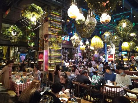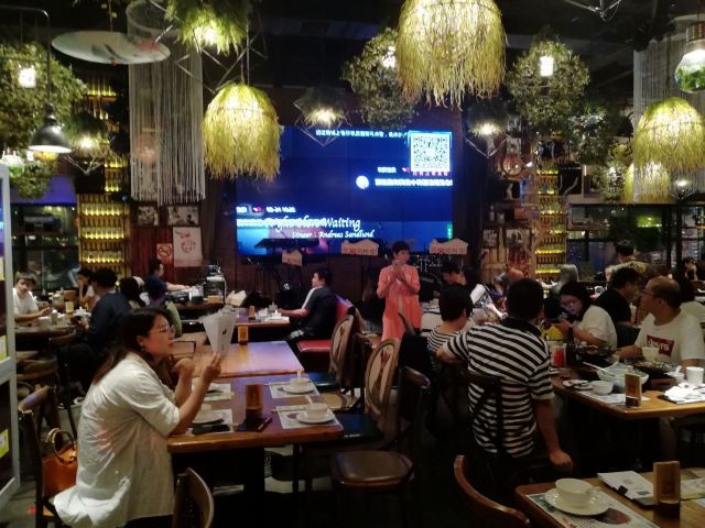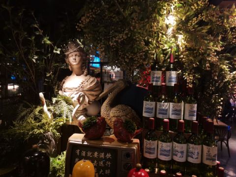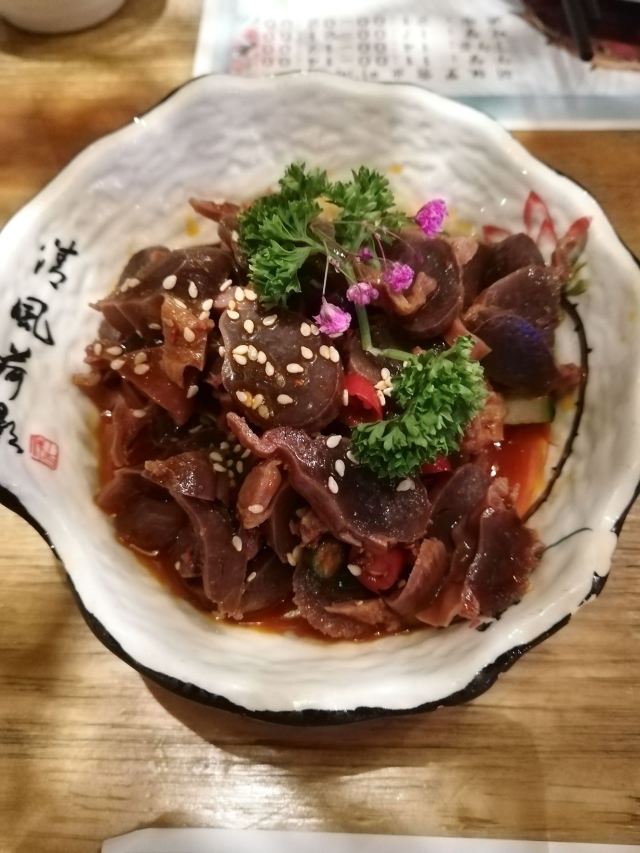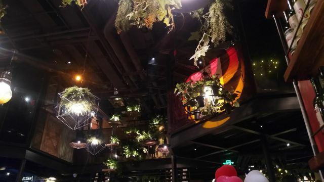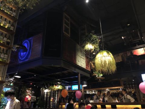 ️ 文艺与大气兼具的门头,门口有个红酒瓶架起的“圣诞树”,一丝葡萄酒发酵的味道从北到南弥漫而来。 ️ 店内设计复古文艺,大多由红酒瓶和绿叶覆盖,给人在森林氧吧的赶脚(虽然绿植都是假的,但是氛围在,哈哈) ️ 送了一个牛皮纸装的面巾纸,还是很柔软的呢。定制的餐桌牌也是很有艺术感。 ️ 菜品:油呛油麦菜,从不吃油麦菜的我,遇上胡桃里的油呛油麦菜,也是控制不住我geiji阿。够入味。 ️ 胡桃里·招牌烤鸡:上菜时是一个鸟笼子送过来的,小哥哥拿走的真快没拍住照片️,鸡肉外焦里嫩,送一碗酱(大概是番茄酱和豆瓣酱配比而成,甜甜辣辣酸酸的)嫩肉沾取酱汁,入口肉味细腻酸甜而又不腻。 ️ 香菇肉酱丸子粉丝丝:小小的香菇瓣倒着放,会有肉酱在香菇的小伞里面,盘子中间是晶莹剔透的蒜末粉丝,丝滑口感。 ️ 今天的胡桃里餐厅有好多人过生日呀,大熊熊送来了生日祝福,现场和工作人员一起跳野狼disco ,好嗨哟。 ️ 胡桃里好像半个小时左右会有一个游戏环节,第一次是摇一摇,没有中奖呢,第二次是数钱数到手抽筋,我得了个第二名,鸡尾酒一杯,真的是太幸运了。好久没这么幸运了,所以很开心。️