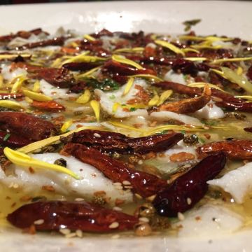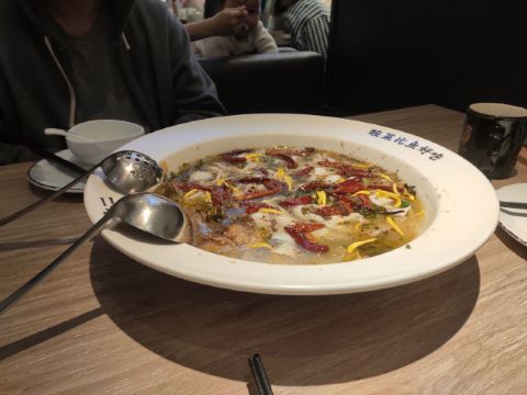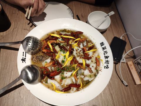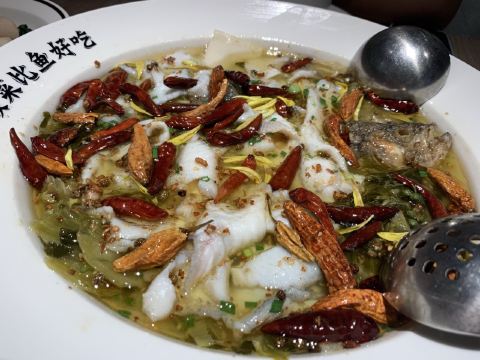 一直排队的店,今天终于决定去拍吧,等了半个小时。不加辣,不减辣,且二且珍惜是他家的口号。三到四人份的有两条鲈鱼,鱼肉很嫩,量也是足的,另外点了些冷饮和小菜,品种不多,味道都不错,免费的陈皮花茶很好喝。说是酸菜比鱼好吃,不过我觉得鱼比酸菜好吃。是的。
