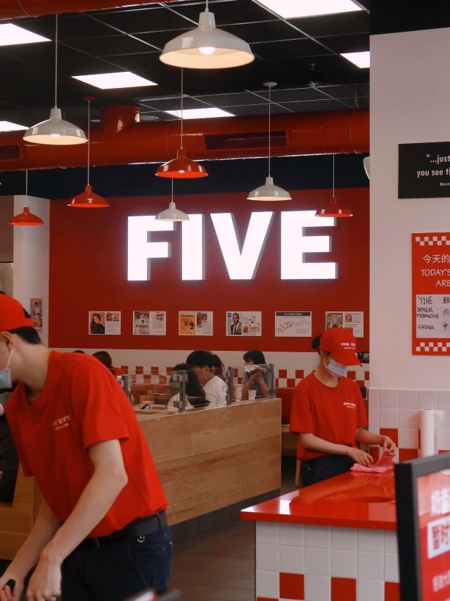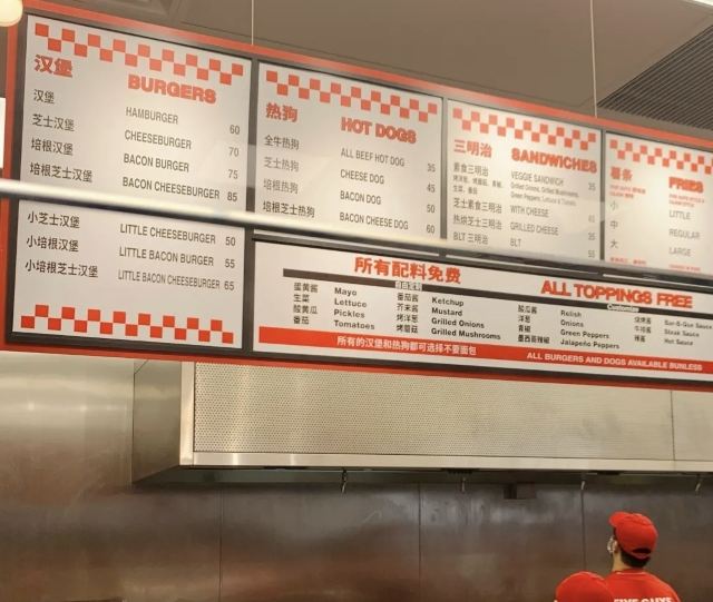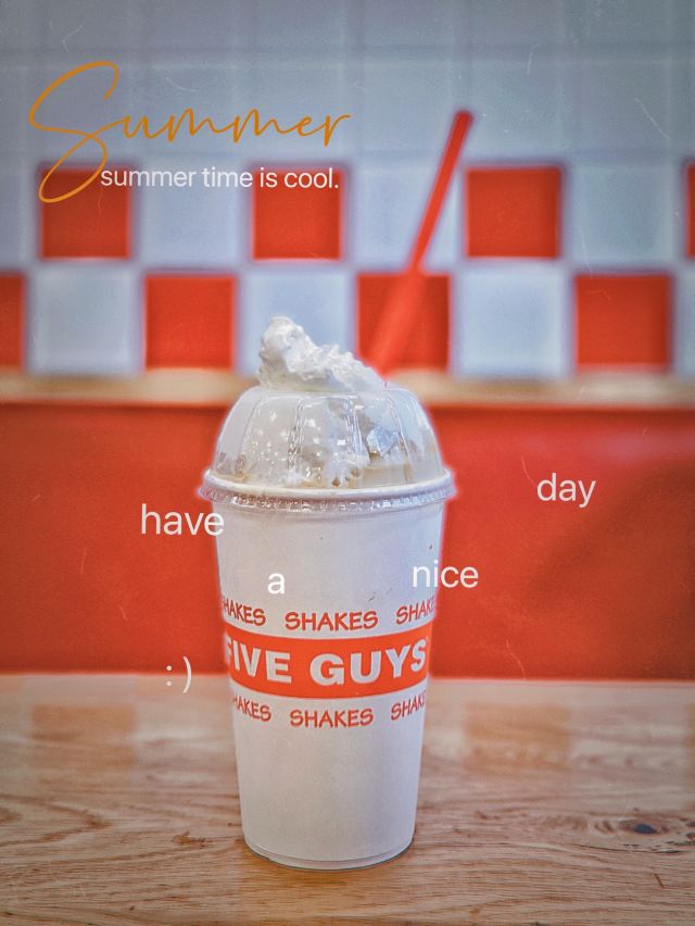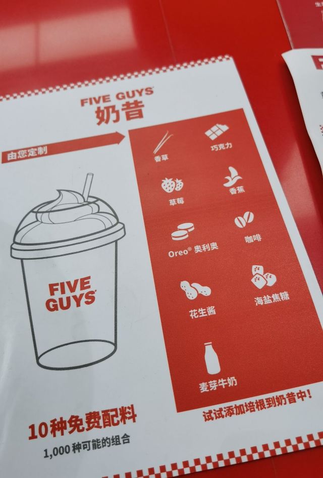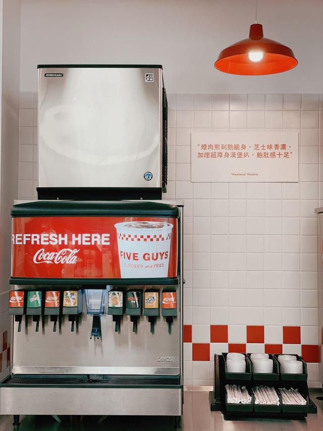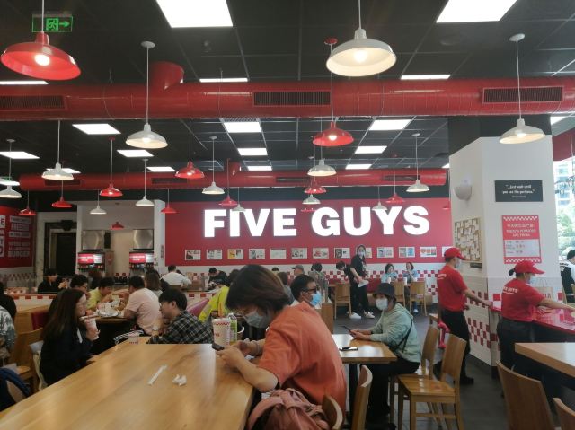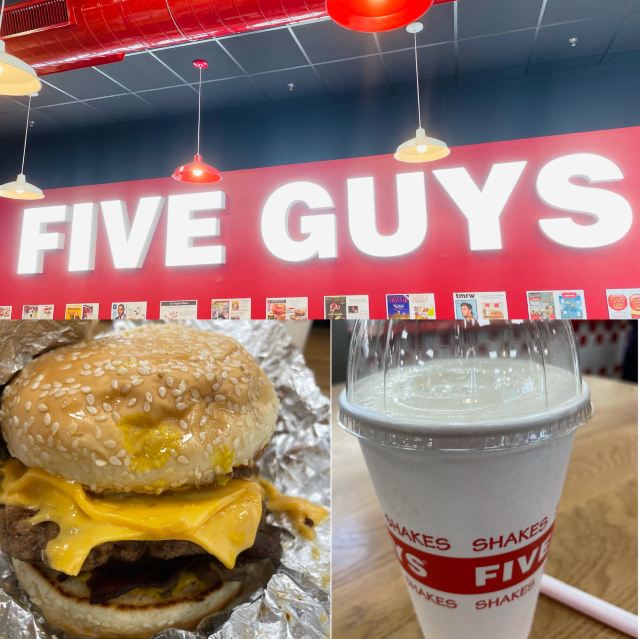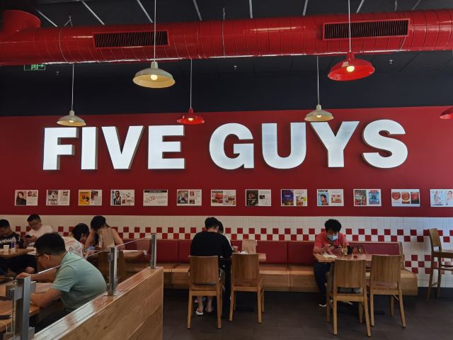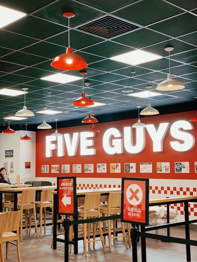 Five Guys终于等到Five guys家,不用排队也能恰到啦~ 📍 「Five Guys」 店铺地址:淮海中路939号巴黎春天1楼 营业时间:11:00-22:00 人均消费:约100元 💰 性价比 品质hin爱,但是价格真的小贵了一丢丢。 毕竟,最爱的In-N-Out,一枚肉肉多&芝士多的Double double,才3美刀+,奶昔更是只需要2.25美刀而已。 「全牛热狗」⭐️⭐️⭐️⭐️⭐️ 烤洋葱、酸黄瓜和黄芥末酱一应俱全的热狗,才是真正🈶️灵魂der! 而所有元素集齐的这一款,口味果然足够正,赞赞。 「芝士汉堡」⭐️⭐️⭐️⭐️ 简直太爱它家的酸瓜酱啦,酸黄瓜控表示完全一本满足,下次要不要double酸黄瓜➕酸瓜酱呢😜😜 汉堡牛肉饼的品质也还不戳,至少比起同类型的某S家略好。 「辣味薯条」⭐️⭐️⭐️⭐️ 微微带辣感的薯条,又是一款别家没有的好味道。 「奶昔」⭐️⭐️⭐️⭐️ 永远觉得美式奶昔偏甜,却也总是忍不住打卡一下下。这里因为有咖啡口味可以选择,貌似会有甜度被中和了不少的错觉😋 偶尔卡路里失控的小放纵,太🈵️足~