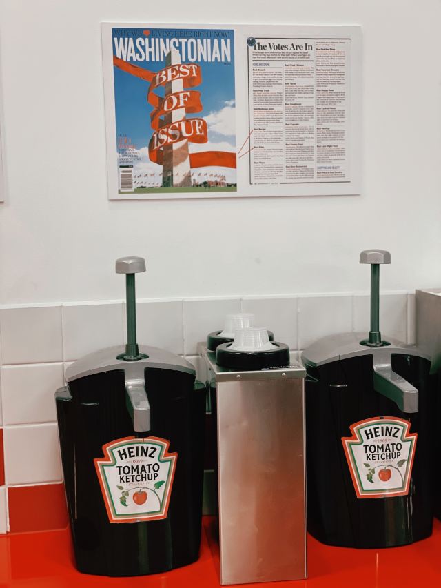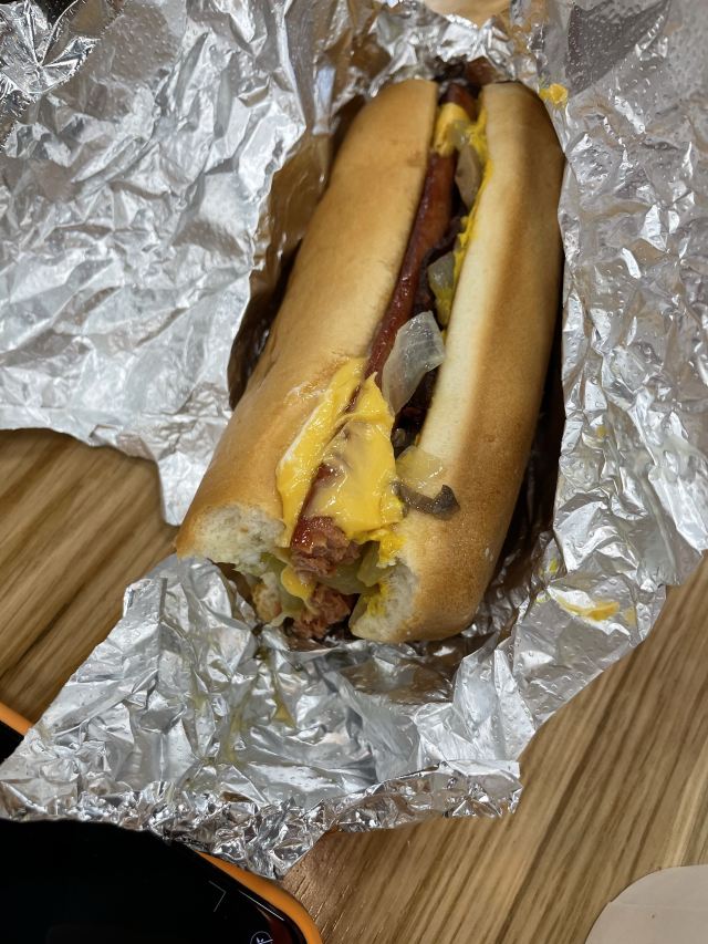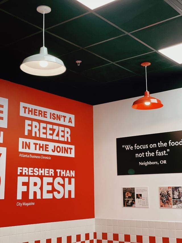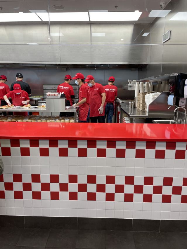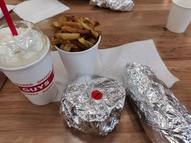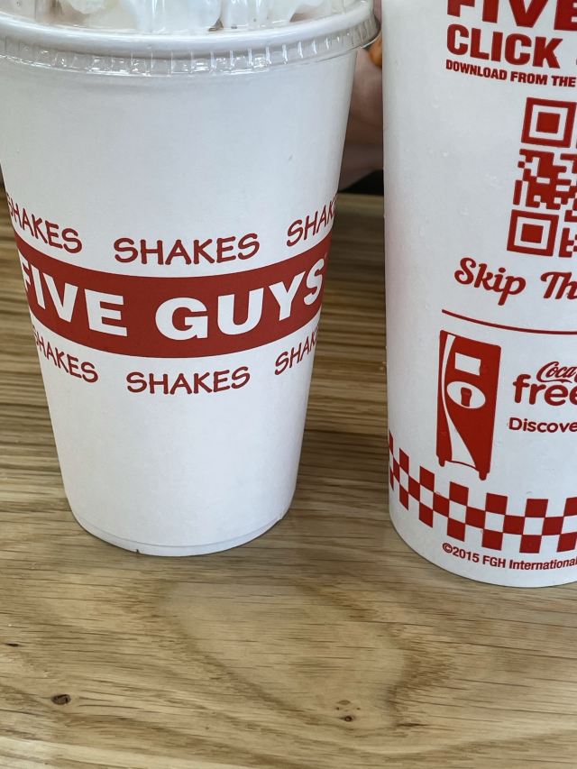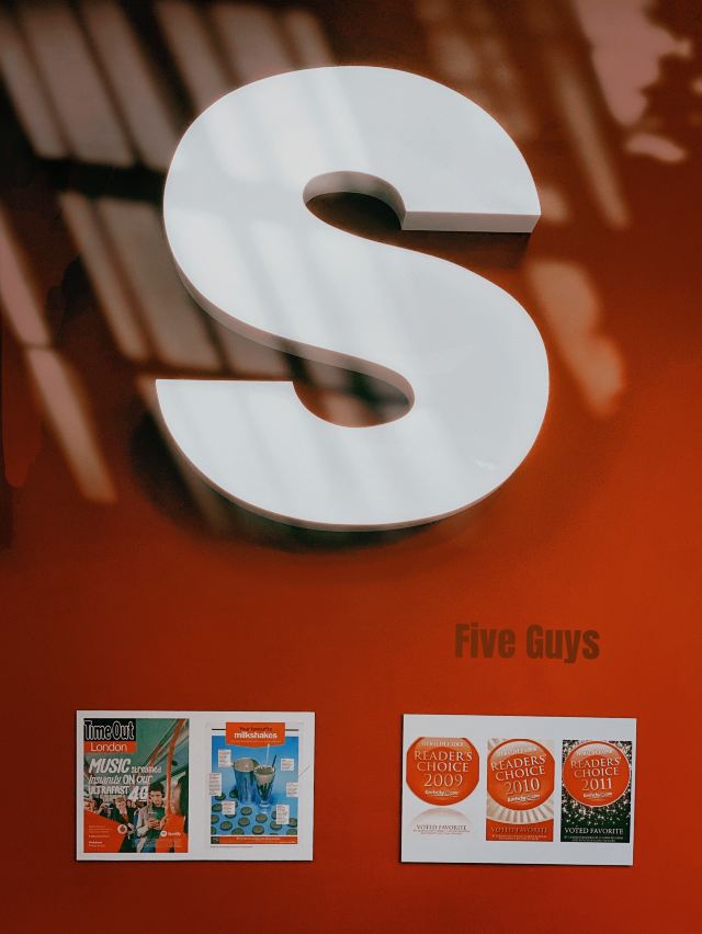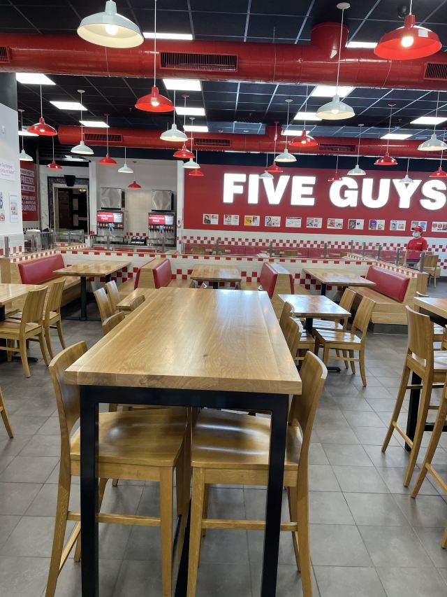 Five Guys终于等到Five guys家,不用排队也能恰到啦~ 📍 「Five Guys」 店铺地址:淮海中路939号巴黎春天1楼 营业时间:11:00-22:00 人均消费:约100元 💰 性价比 品质hin爱,但是价格真的小贵了一丢丢。 毕竟,最爱的In-N-Out,一枚肉肉多&芝士多的Double double,才3美刀+,奶昔更是只需要2.25美刀而已。 「全牛热狗」⭐️⭐️⭐️⭐️⭐️ 烤洋葱、酸黄瓜和黄芥末酱一应俱全的热狗,才是真正🈶️灵魂der! 而所有元素集齐的这一款,口味果然足够正,赞赞。 「芝士汉堡」⭐️⭐️⭐️⭐️ 简直太爱它家的酸瓜酱啦,酸黄瓜控表示完全一本满足,下次要不要double酸黄瓜➕酸瓜酱呢😜😜 汉堡牛肉饼的品质也还不戳,至少比起同类型的某S家略好。 「辣味薯条」⭐️⭐️⭐️⭐️ 微微带辣感的薯条,又是一款别家没有的好味道。 「奶昔」⭐️⭐️⭐️⭐️ 永远觉得美式奶昔偏甜,却也总是忍不住打卡一下下。这里因为有咖啡口味可以选择,貌似会有甜度被中和了不少的错觉😋 偶尔卡路里失控的小放纵,太🈵️足~