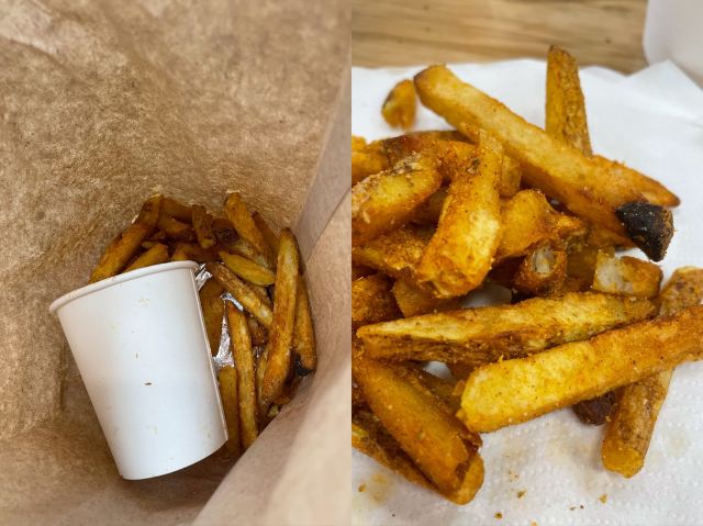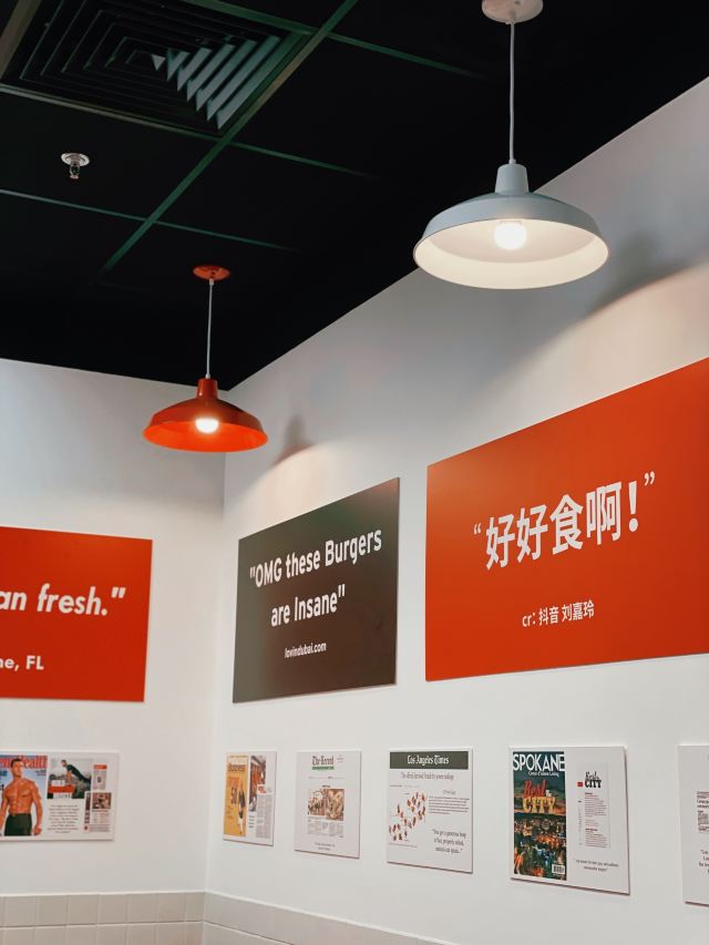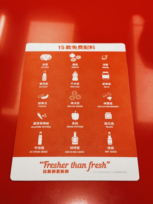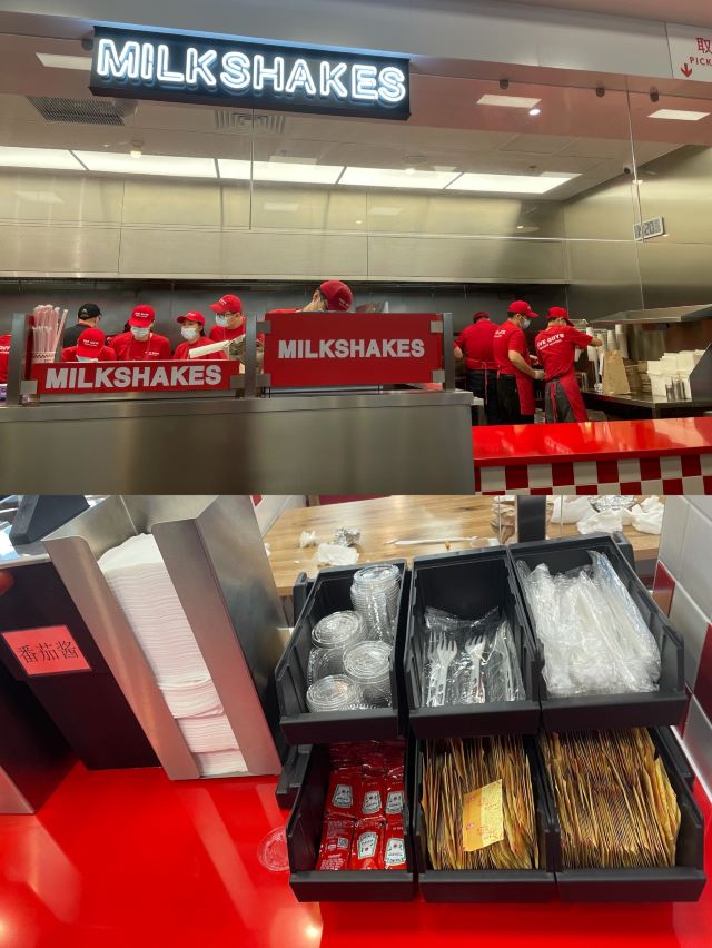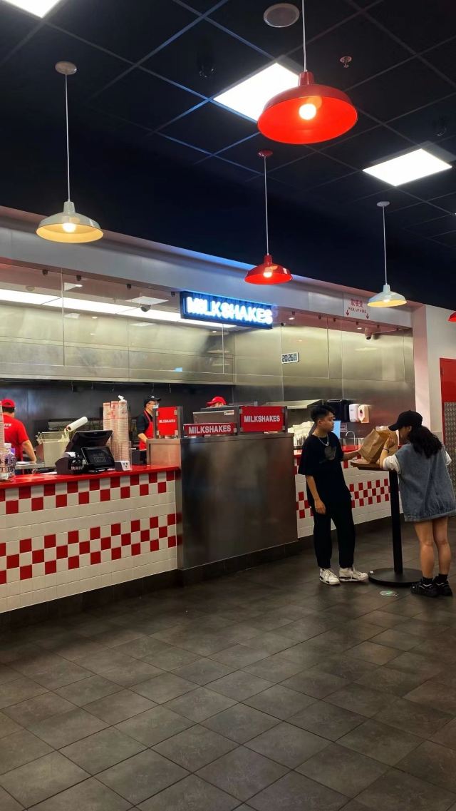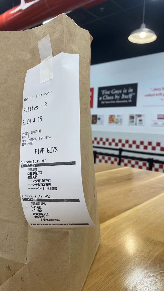三十五秒十三分五月份开的这家FIVE GUYS 绝对是引爆魔都美食届, “刘嘉玲推荐巨好吃的汉堡‼️”, 这号召力还是可以的🤑 ✨至此,魔都集齐了全美三大汉堡店 Habit、five guys、shake shack😆 最近这排队热潮已经褪去, 那我也来试试看🤭 从排队到拿到汉堡整个过程不过20分钟, 还是可以接受的👌 👉单层牛肉芝士汉堡 吃过的人都说培根太硬,所以我选了这款。 虽然另加食材“all in”的噱头十足, 但每个人还是根据自己喜好选择比较好~ 比如我就没选生洋葱和酸黄瓜🤭🤭 烤蘑菇、烤洋葱、番茄都选上了, 不过一不小心忘了生菜😂 ✅酱选择了蛋黄酱+芥末酱。 吃起来。。emmm牛肉饼挺厚的, 所以吃起来就挺一般的,中规中矩。 👉原味薯条 小分薯条要💰32一份, 不过配餐的老外服务员倒也是挺随意的, 一小杯装满后又往纸袋里放了不少! 所以一个人吃的话,选小份足矣! 📜所以。。 不排队的话来尝试一次即可吧! 🍽【美食攻略】 📍详细地址:淮海中路939号巴黎春天1楼 🚗交通攻略:地铁1、10、12号线陕西南路站 🕙营业时间:11:00~22:00 💰人均消费:90元