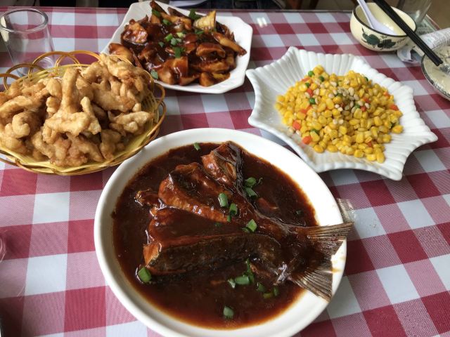 一家开在上海共青森林公园里的餐厅,餐厅外环境极佳,坐在室外,可以直接欣赏到湖中的喷泉⛲️。 室内的装修风格确实标准的农家乐餐厅,点了几个菜都是他家的招牌菜,烧制手法也是接待团队的那种团餐,当然,椒盐排条的味道还是不错的。 价格还行,这些菜加一碗米饭最后买单160元。