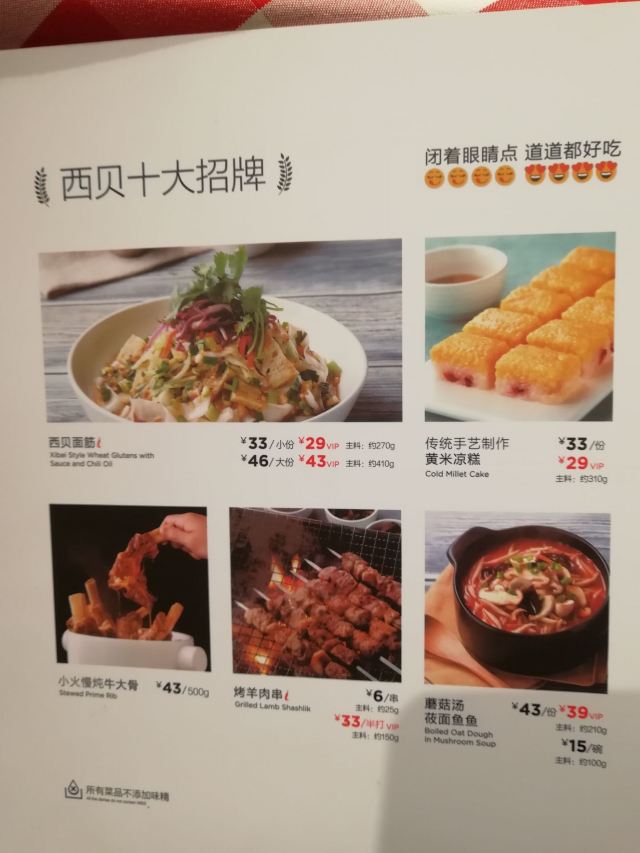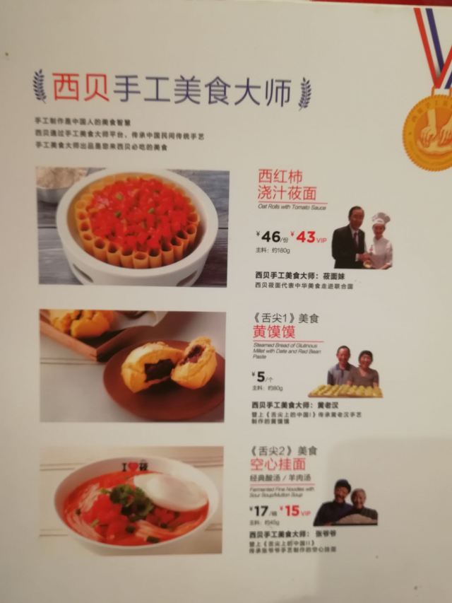 烤羊肉串,牛大骨,秘制烤羊棒,西贝自制酸奶,羊肉汤莜面鱼鱼,西贝凉皮,葱香烤鱼,自制石墨豆腐,铁板包菜炒粉丝,西贝酸奶酪,油泼香椿莜面,冷榨胡麻油调黄瓜,烤羊腿,炝炒牛心菜,烧羊棒,西贝面筋,酸汤莜面鱼鱼,黄米凉糕,烤羊排,酥皮肉夹馍,西红柿浇汁莜面,蘑菇汤莜面鱼鱼,沙棘汁饮料,黄馍馍