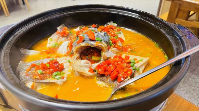相当的辣,典型湖南口味,红辣椒满盘皆是。喜欢辣的不错的选择