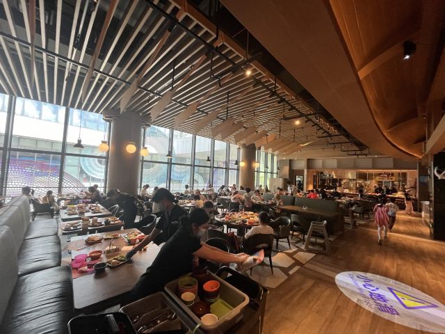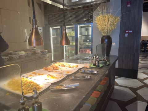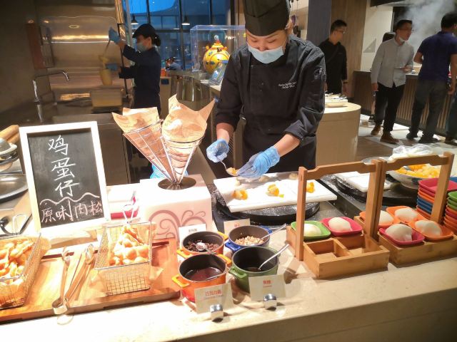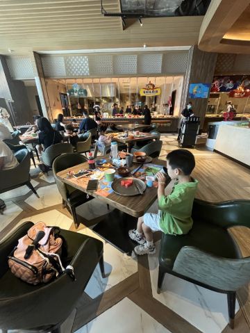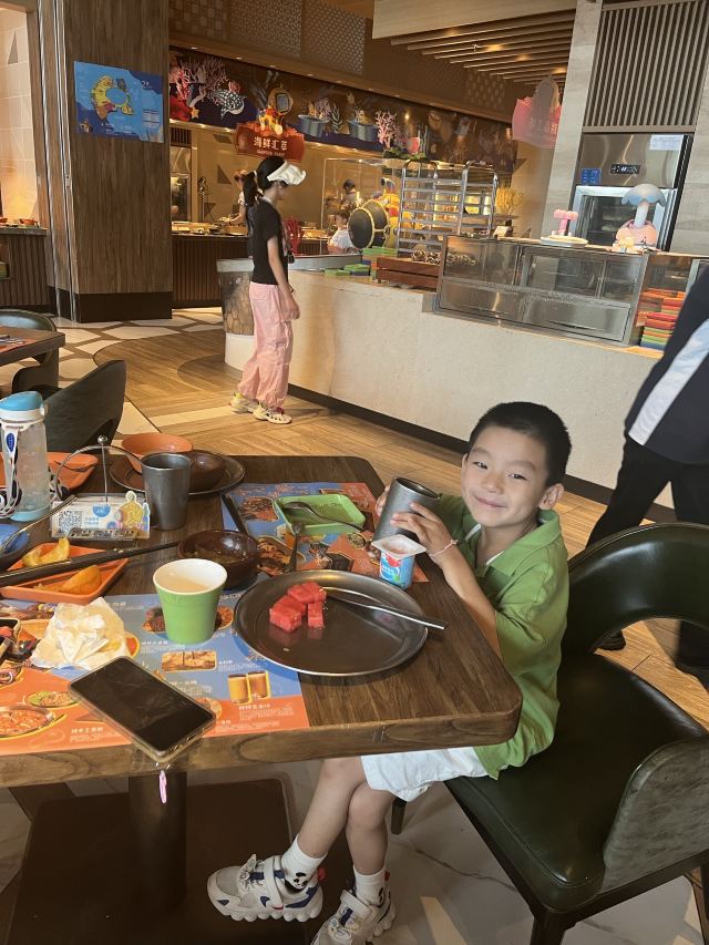 Maggie想上天🌃 【环境】:一早上就有轰轰烈烈的大食堂的感觉,突然就睡意全无,太开心了。 第一次早餐吃的这么热闹像晚餐,果然孩子多的地方就是气场热烈。 位置在酒店的二层平台,坐在窗边可以看到一层中庭。 💁 【服务】:nice!在门口核销,非常迅速,一分钟就搞定进去找位置坐下。餐厅够大,即使游客超级多也不用等位置,工作人员收拾迅速,离开一桌就马上收拾好了。而且临近结束会每桌提前通知到再去拿点吃的,以免时间到,档口没有食物了。 档口补充食物也很积极,会一直保持有餐品齐全。 🍳 【口味】:口味齐全。看着是中式西式,天南地北的食物都有。完全不像是在吃早餐。 现烤华夫饼🧇太香了,旁边围满了小朋友。 🧃也很多种,简直是小朋友的天堂。 携程买的早餐卷也很划算,这个早餐情绪价值拉满了!😄