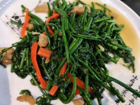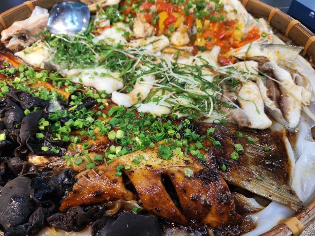 到斗门出差,到了饭点,搜到这家饭店,决定去试一下。这家店是做顺德菜的,筲箕鱼是招牌,其实是一条鱼三种蒸法,都放在一个大筲箕中。鱼肉清蒸,鱼腩豉汁蒸,鱼头剁椒蒸。三种风味,一次都可以尝到,有特色。觉得最好吃的还是清炒护肝菜,其他地方比较少见,口感脆脆的,类似于小芥兰。