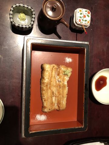 莫扎扎315看到了蔡澜一篇写鳗鱼的文章,大力推荐了东京塔附近的五代目野田岩,这间1800年创业,已经200多年历史的小菜鳗鱼冻一上来,晶莹剔透,像是一块刚凝结起来的琥珀。没有任何思想准备地尝了一口,脱口而出“美味しい!”那表情如果录下来的话一定不逊于日本美食节目品尝员的夸张程度,何况这完全是由心而生的真实写照。吃和牛时没能精确感受到的“入口即化”,居然跑到一家鳗鱼饭店切身体会了!而且鱼冻中也留有浓度极高的鳗鱼鲜味,满口清香,简直可以下一合日本酒。 接下来是白烧鳗鱼(志ら焼き),和蒲烧相比少了酱汁,纯粹是引出鳗鱼本来的香味。红色漆器正中央一块烧烤后的四方鳗鱼,如待嫁的新娘。左下角放了一小撮盐,虽说搭配芥末和酱油也可以,但最简单的吃法,蘸盐,才是最美味的。 在野田岩吃饭要花得起时间,点了鳗鱼起码要等四十分钟才上桌,朋友们要有耐心哟~