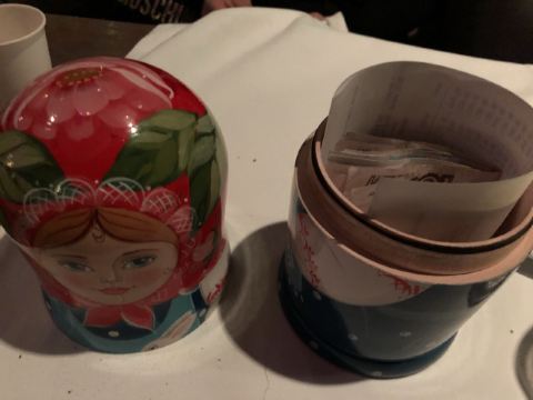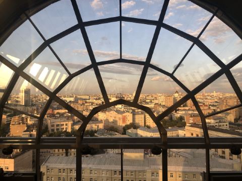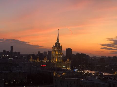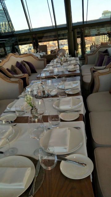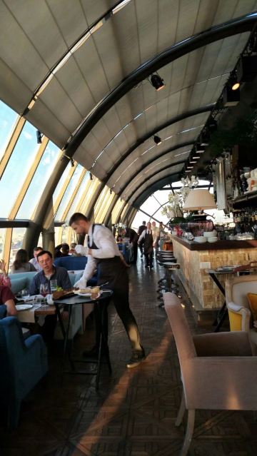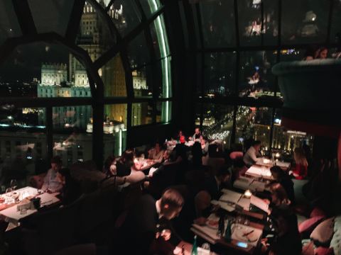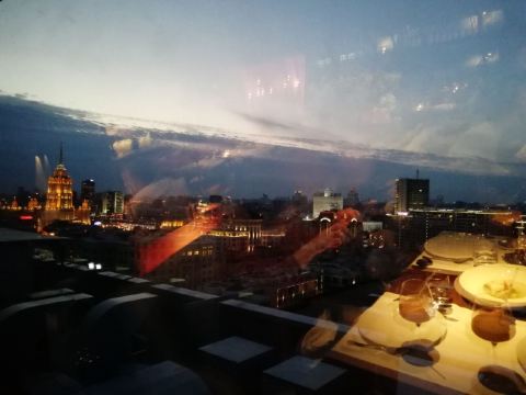 快乐的旅游者tiger我通过携程订座,到餐厅后因为着装(运动装)不合格而被拒绝入内,行前我还问了携程订座客服餐厅对着装是否有要求,客服回答没有要求,这下尴尬了。不得不到楼下花了4000多卢布买了衬衫和裤子,穿好后才被允许入内,事后携程订座客服将订餐费退给我,还报销我的服装费。 餐厅有中文菜单,我们没有按携程推荐的点菜,而是选了菜单首页的套餐(10000卢布/人),味道重,有点偏咸,但总的来说味道不错,很有特色。餐厅环境很好,可以俯瞰莫斯科夜景。服务不错(小费另收了970卢布),但无人懂汉语(还好我们带了讯飞翻译机),且上菜速度慢,我们花了4个小时吃饭(这点他们已事先告知)。如果不点套餐,上菜速度会快些。 总之,很棒的体验,是我们在莫斯科难忘的一餐。