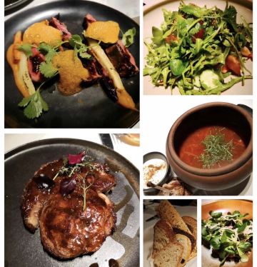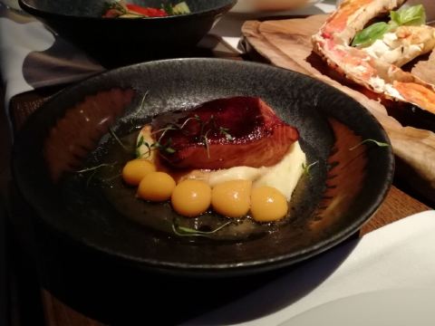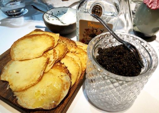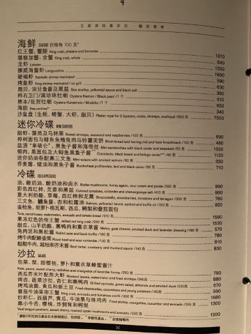 肉眼牛排,烤羊排,海鲈鱼配竹笋,鹅肝蜗牛配面包,牛舌色拉,橘子蜂蜜蛋糕,牛排,鱼子酱,红菜汤,莫斯科烤鱼,莫斯科鱼子酱,冷酸鱼