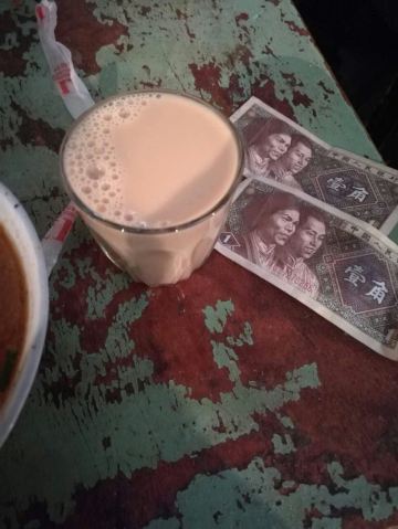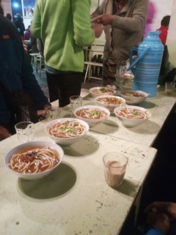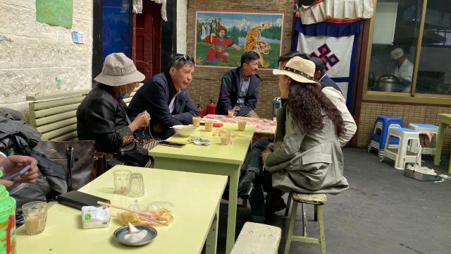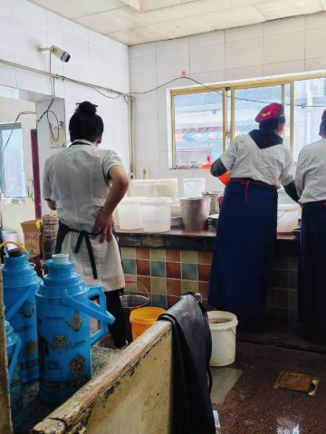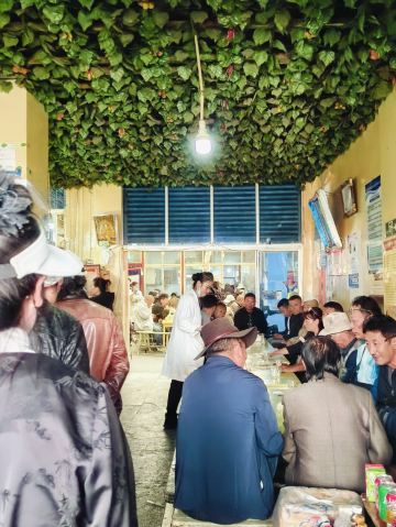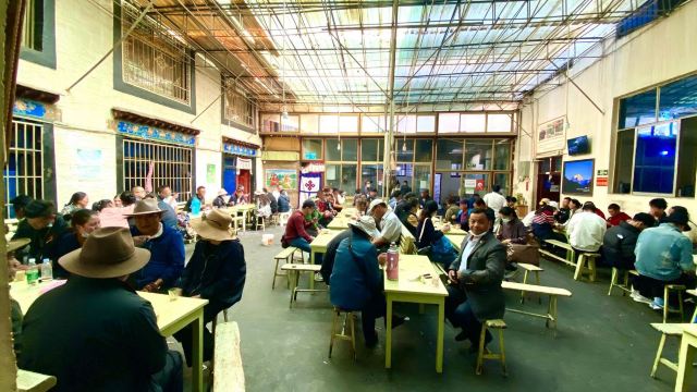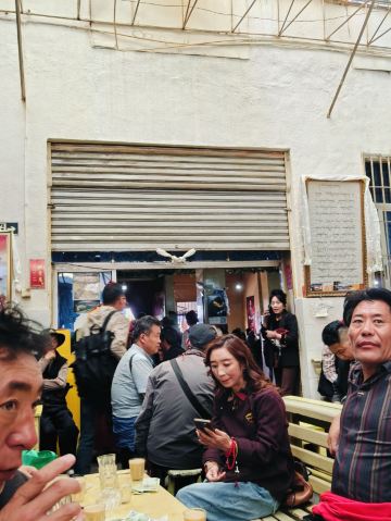 熊大最帅在来拉萨之前就已经攻略了这个茶馆,知道它是当地藏民最爱去,也是最具拉萨市井气息之处。我们从大昭寺游览完刚刚近十一点,就直奔这来了。甜茶馆大门口是条商业街,来来往往的人本就多,一踏进门就更热闹了!只见三四张长条桌拼接成的超长桌边坐满了人,像这样的超长桌子一间房里摆了有近十排,左右两边还有几间差不多大小的房子,而且基本都坐满了,这种阵仗的茶馆我们真是头一回见识到!长桌旁的每个人面前几乎都放着一个塑料茶杯和一堆面值很小的零钱,众人们喝茶抽烟聊天说说笑笑着,一派热闹详和氛围,谁的杯里没茶了就挥手吆喝一声,提着一个硕大金属茶壶的小二就会立刻来给你添满,续个杯只用花几毛钱,小二会自己从桌上零钱堆里拿,哪位桌上零钱不够,小二也能负责换散,因此来这喝茶相当实惠!聊久了肚子饿的,还能去前台花几块钱买碗藏面或藏式饺子,这儿的面食都是青稞面做的,很粗有劲道又耐嚼,但口味真不敢恭维,面条少油少盐青汤寡水,饺子也基本没啥馅,唯一就是管饱!所以,我看来的汉人们基本都是浅尝一下,主要感受气氛而已!