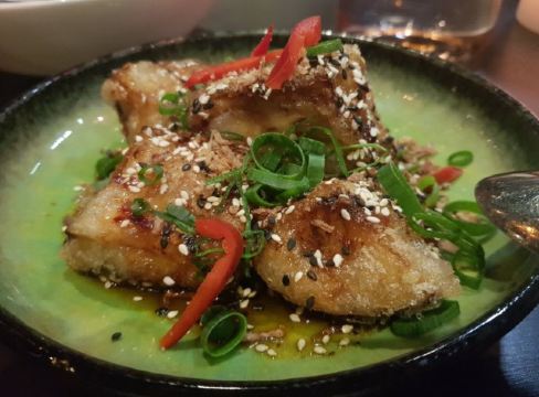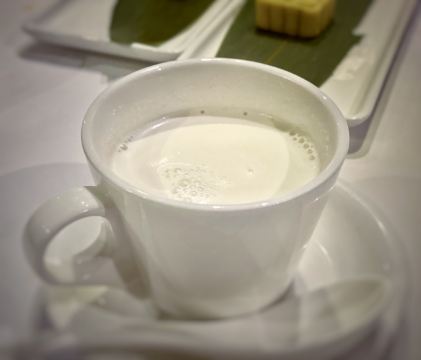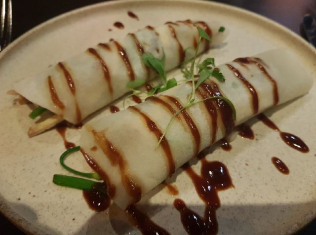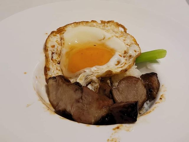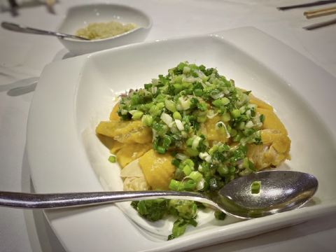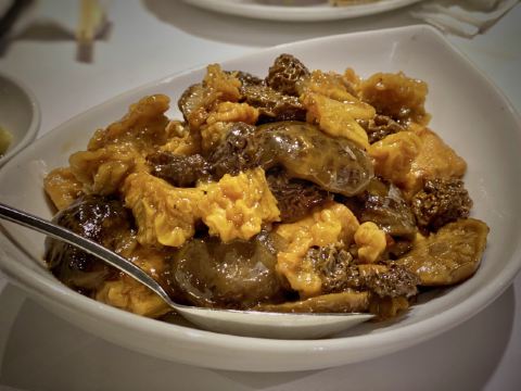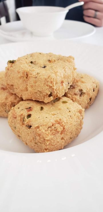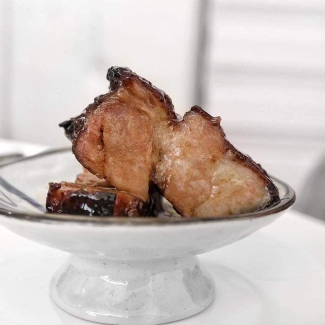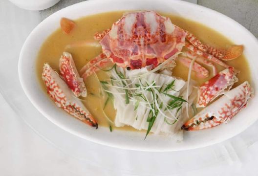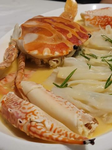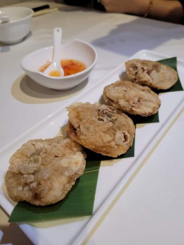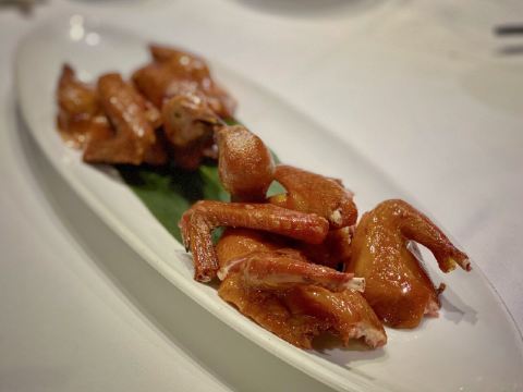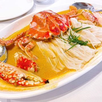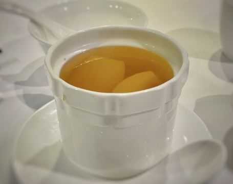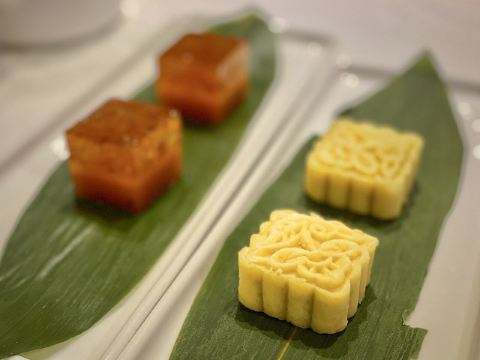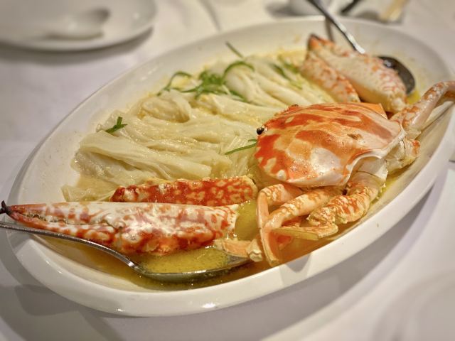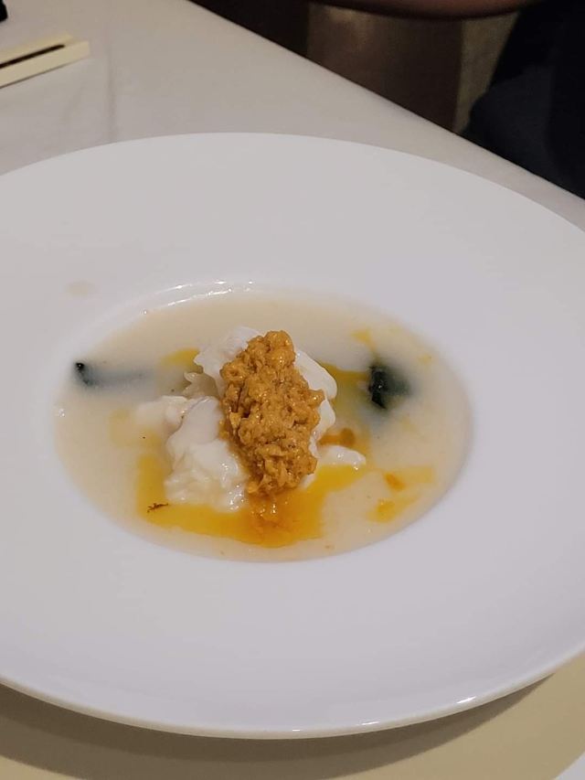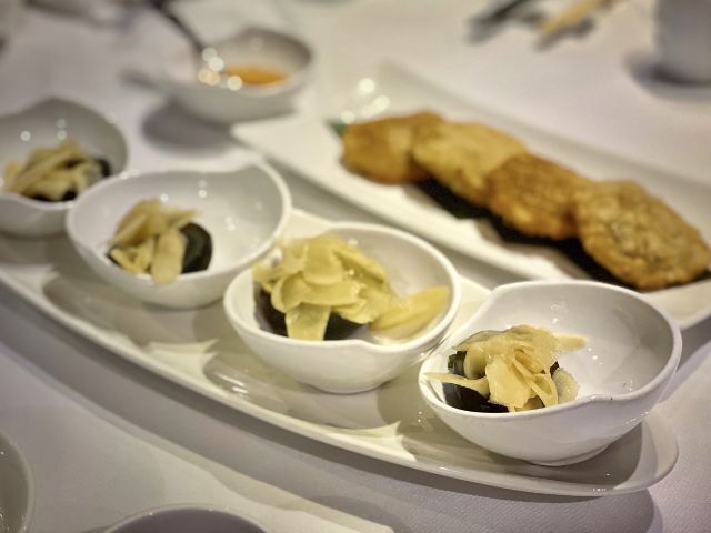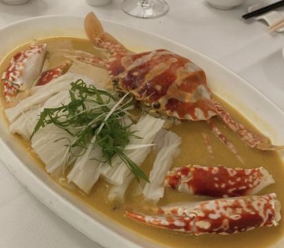 DathyD蟹肉香菇盒子,盒子香脆,炸的不腻,馅料和外皮比例恰到好处,喜欢。 皮蛋子姜,子姜很香甜,而且很嫩,我个人原因没吃皮蛋。 龙井菊花烟熏乳鸽,这道乳鸽味道没得挑剔,不过龙井菊花的味道不明显,个人认为鸽子偏瘦,骨肉相连处肉质偏柴,但可能也因此丝毫不腻。 羊肚菌冬菇闷腐皮,这里的腐皮很大,内含多层,非常吸汁。 鸡油花雕蒸大花谢配陈村粉,还是这里的花雕蒸蟹配陈村粉好吃,可能是加了鸡油的关系,酱汁味道饱满不单调,陈村粉质地恰到好处,柔软又滋润。这道还是胜过香港其它几家。 慢煮干葱炬滑鸡,鸡肉很嫩,看似油腻,实则不会。慢煮的干葱非常调味。 苹果雪梨瘦肉汤,这道汤太喜欢了,苹果炖的软嫩,汤体不浓不淡,味美而原始,没有特别多调味的味道。我一般完全不会品尝汤里的瘦肉,但这碗里的瘦肉居然也没有很老的口感。 枸杞桂花雪糕,奶气十足,微微甜而不腻,桂花香气清淡,枸杞滋味忽闪忽现,喜欢这种淡然类的甜品。 生磨杏仁茶质地稠淡恰到好处,完全不觉得甜,但香气扑鼻。 糕点类甜品,都不会很甜,各种味道都很清淡。