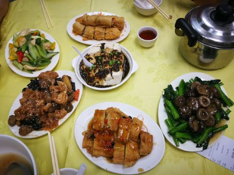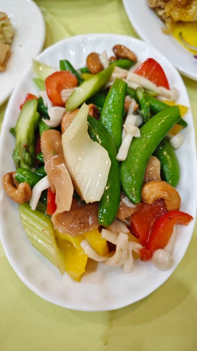 素斋,山水豆腐花,脆皮炸春卷,花菇扒时蔬,彩色豆腐,菌菇炒素,萝卜丝卷,花菇青菜,斋烧鹅,古法老火汤,炒面